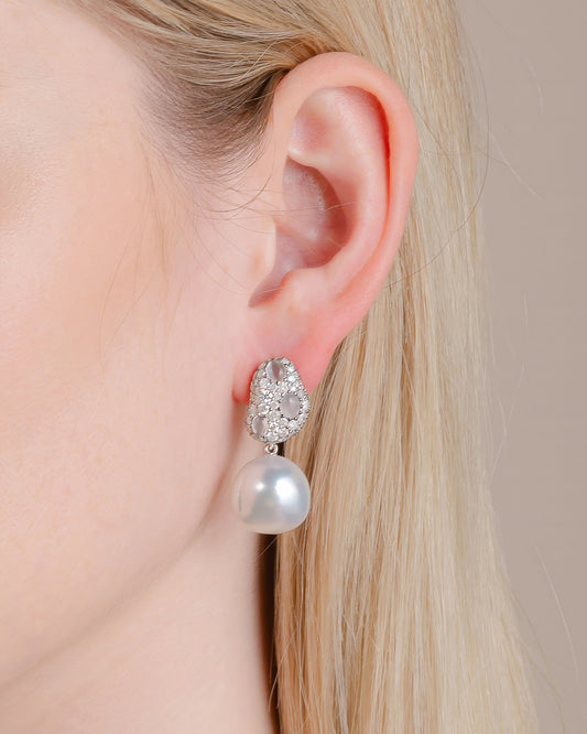 White Moonstone & Milky Diamond Pearl Drop Earrings