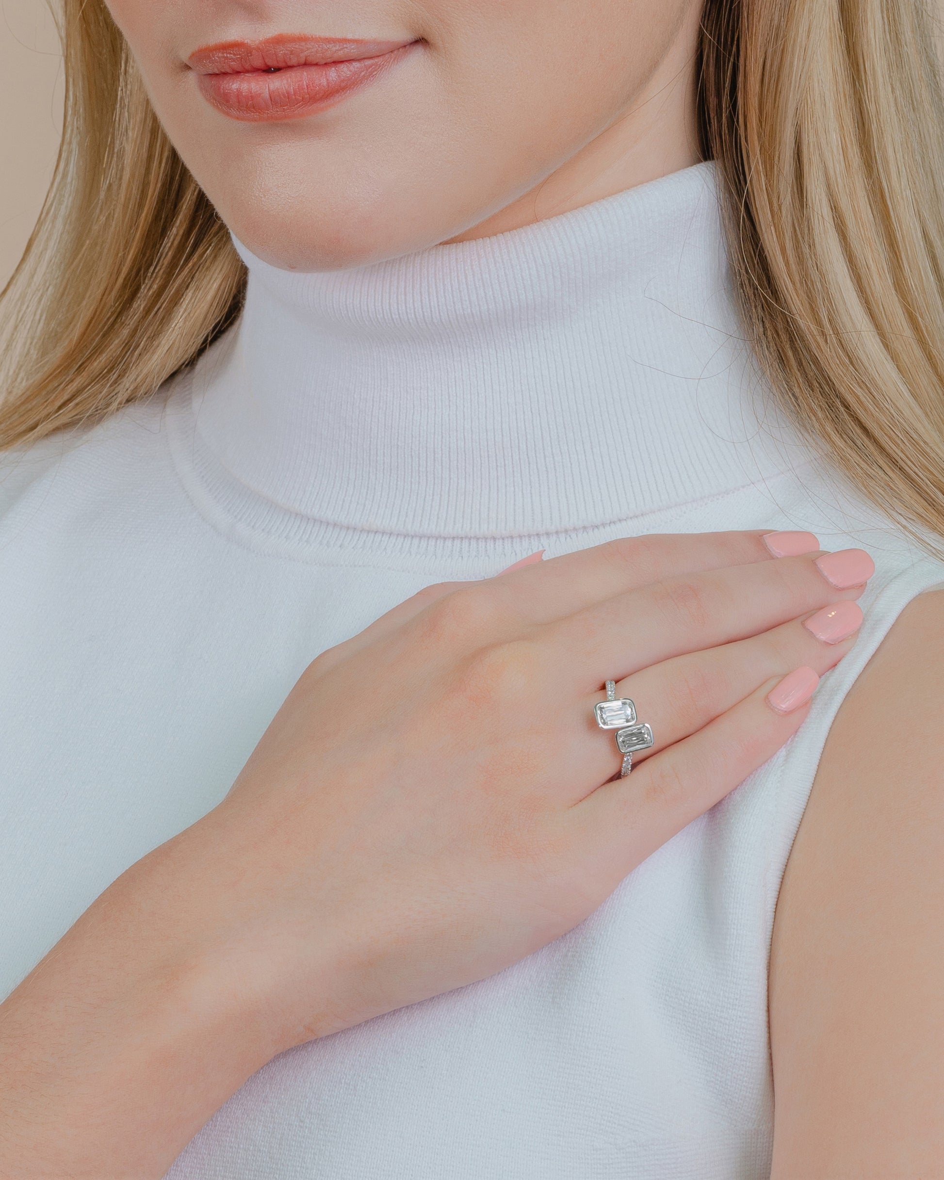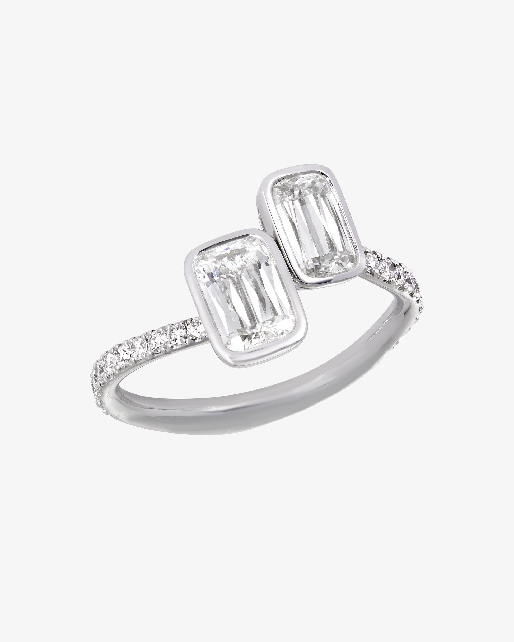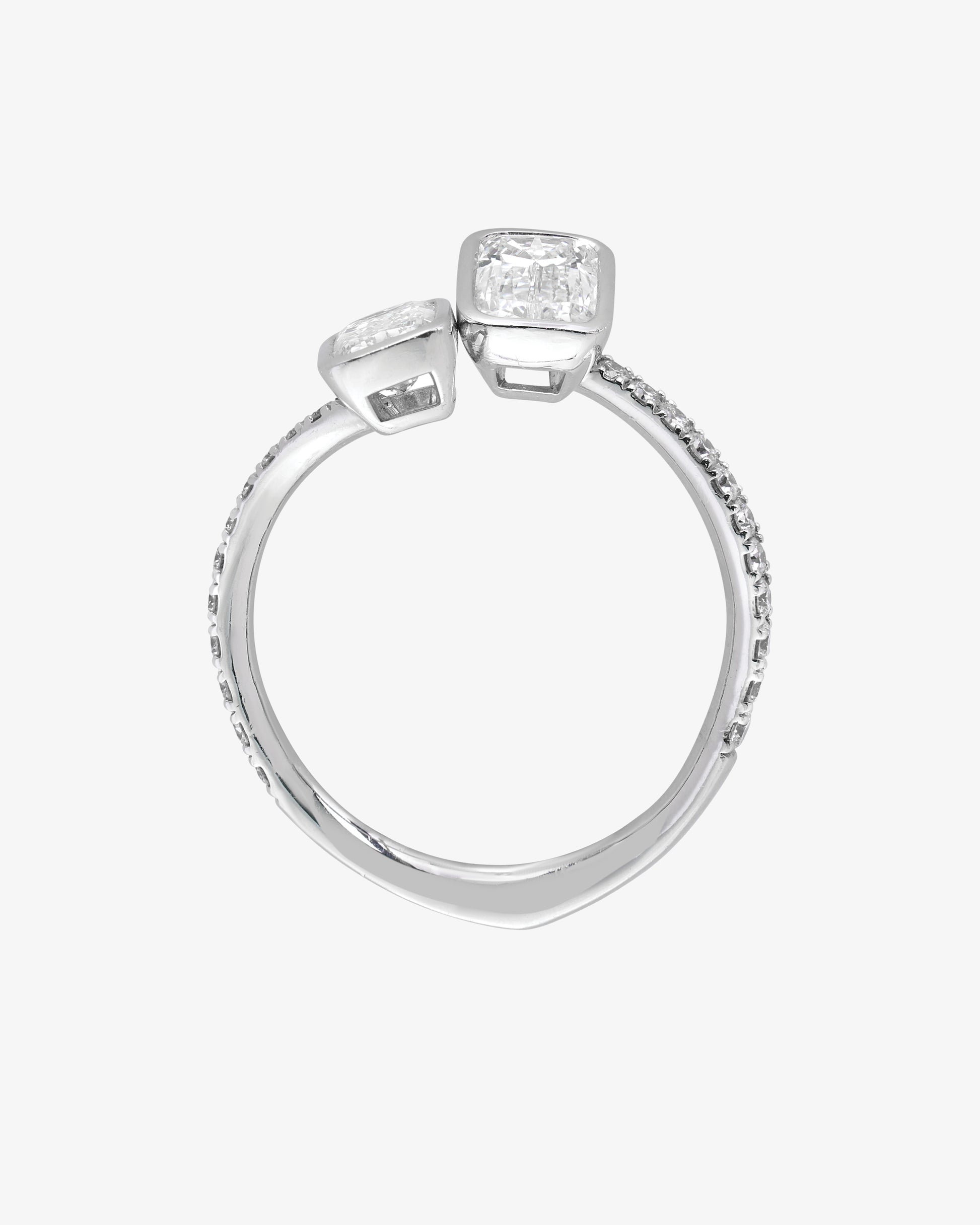 An irresistible bypass ring, featuring two ASHOKA® cut diamonds on a micropavé diamond band, set in 18 Karat White Gold.