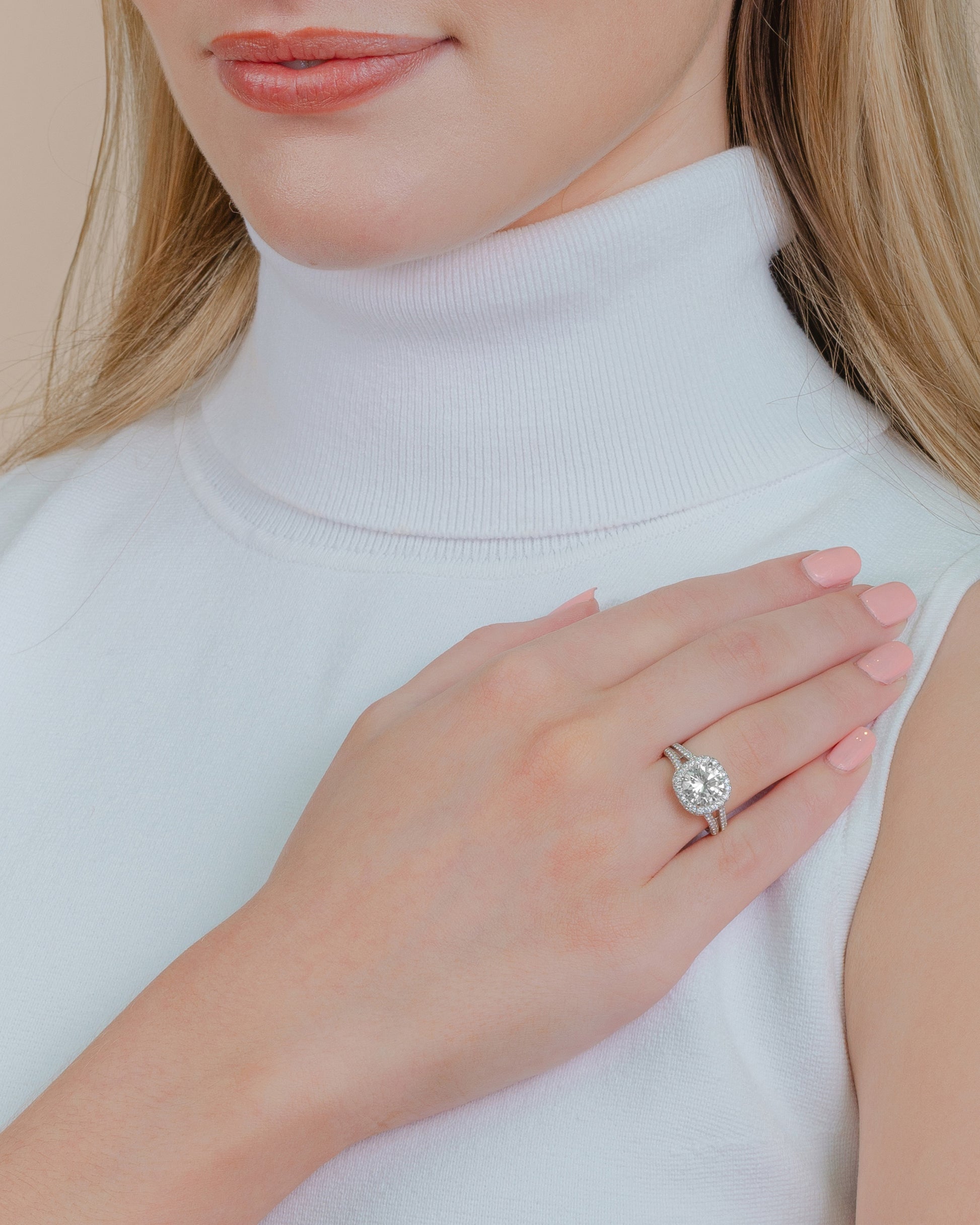 18 Karat White Gold 1.98ct Diamond Engagement Ring in 4-claw setting surrounded by 2-row of halo set Diamonds.