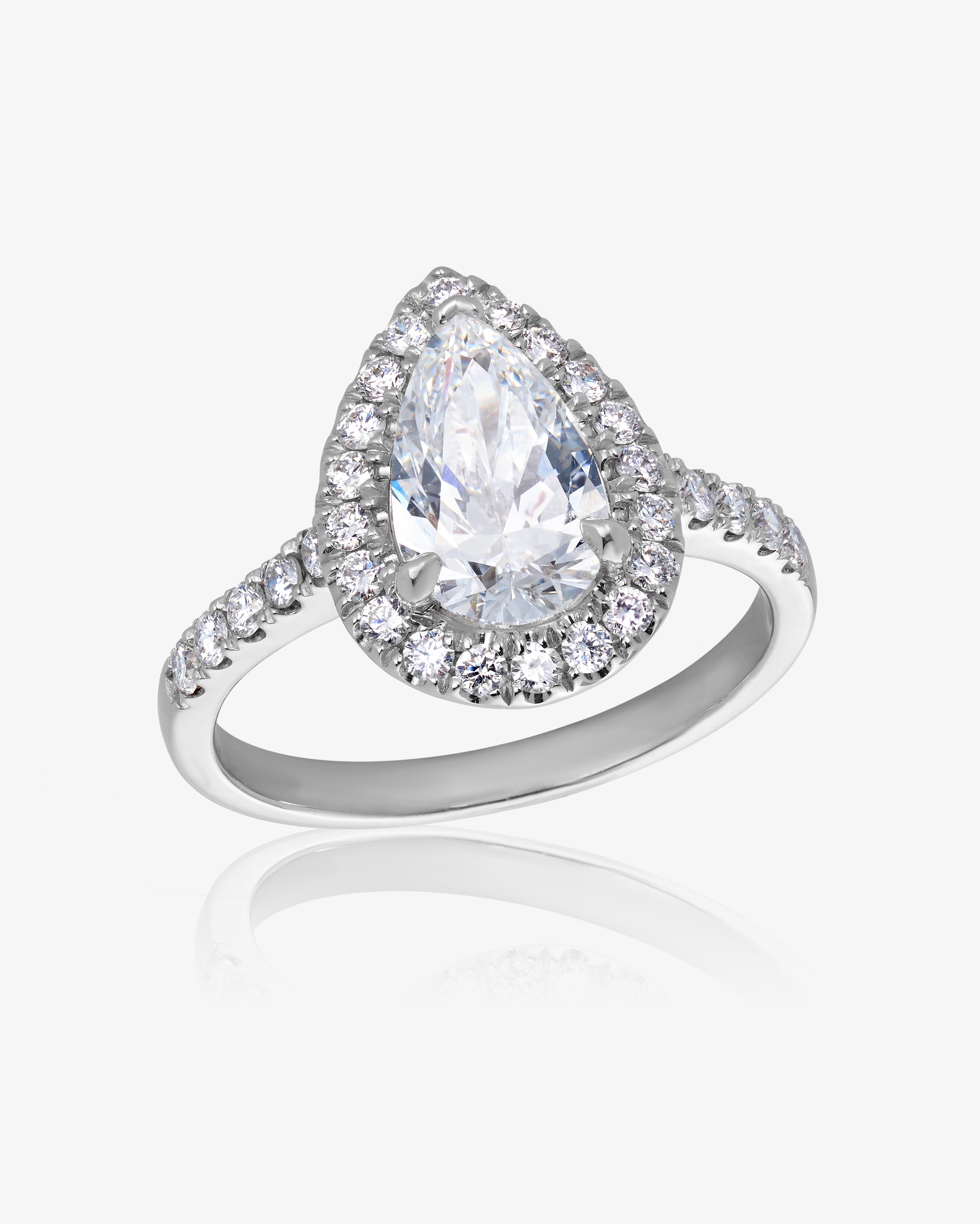 Claw set with a 1.50ct E colour, SI1 clarity, Pear Cut Diamond and a round brilliant cut 0.65ct halo.