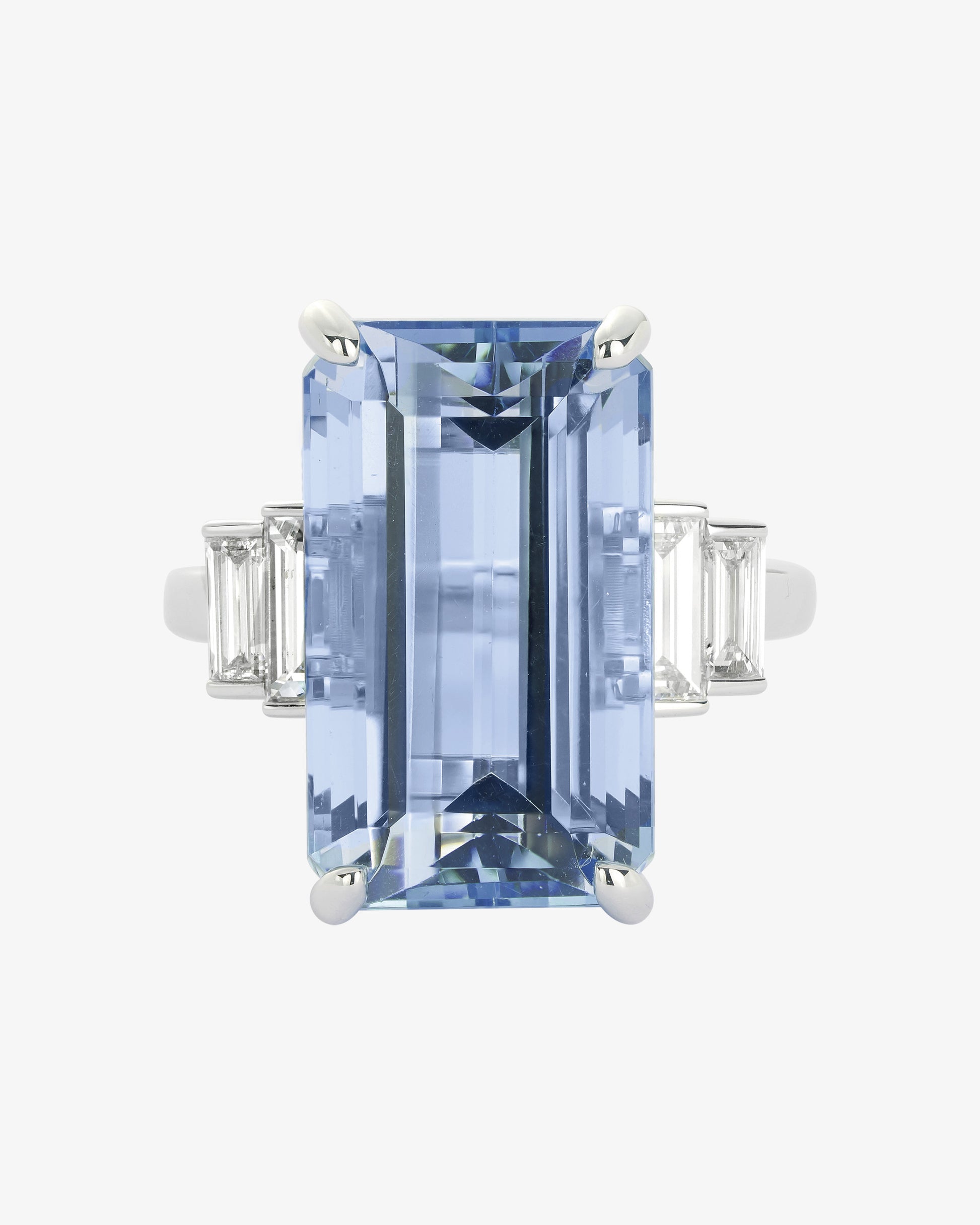 18 Karat White Gold Ring Set with a 13.14ct Emerald Cut Aquamarine and four 0.84ct HI VS Baguette Diamonds.