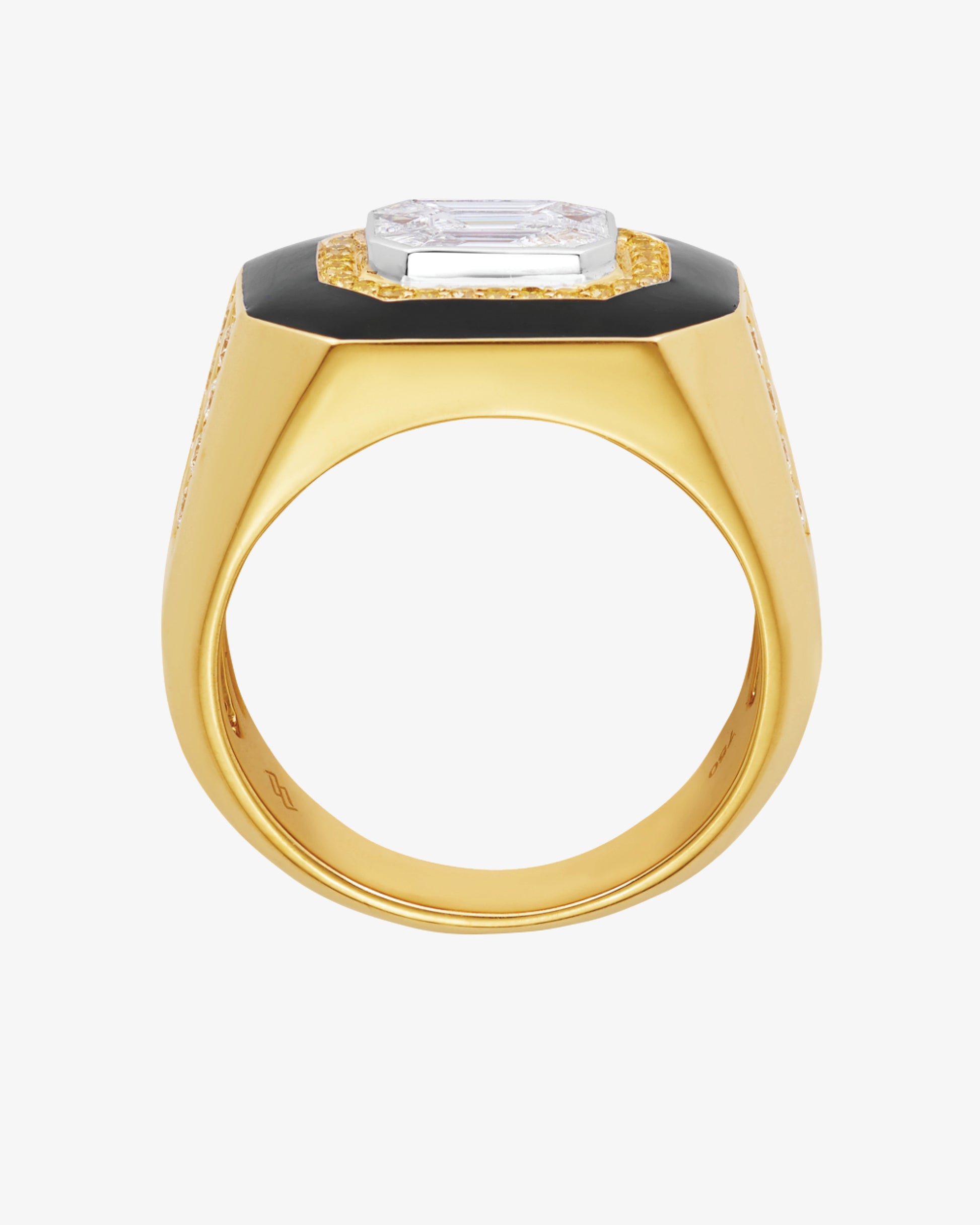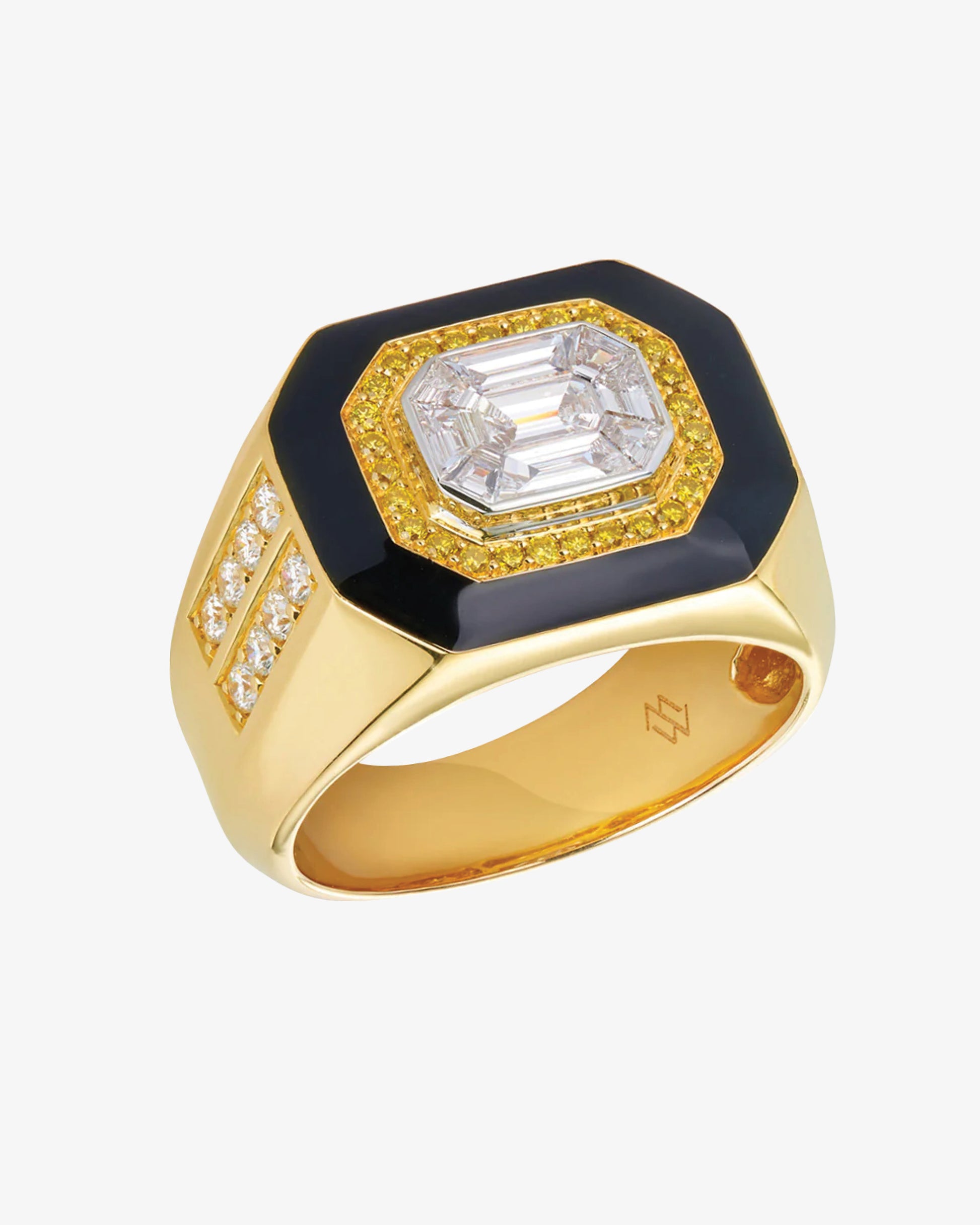 18 Karat Yellow & White Gold Ring featuring 1.13ct G colour, VVS-VS clarity, Invisible set with round brilliant cut Diamonds 0.22ct and round brilliant cut Yellow Diamonds with 0.85ct Black Enamel.