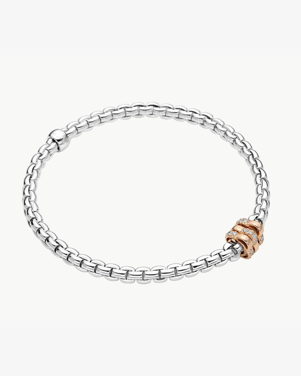 FOPE 'Eka Tiny' Collection 18 Karat White Gold Flex'it bracelet with 18 Karat Rose Gold and Diamond Pave' Rondelles. Total Diamond Weight = 0.16ct. Total Item weight: 9.11gm.