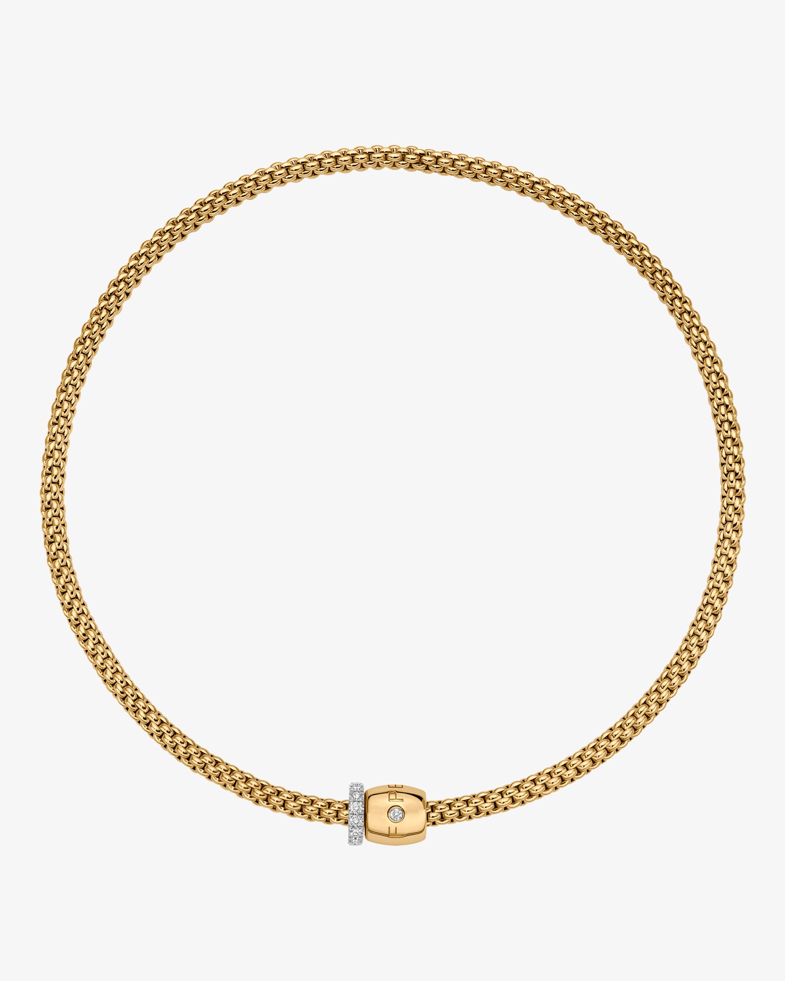 18 Karat yellow gold necklace with an 18 Karat white gold rondel featuring diamonds total weighing 0.47ct G Colour, VS Clarity.