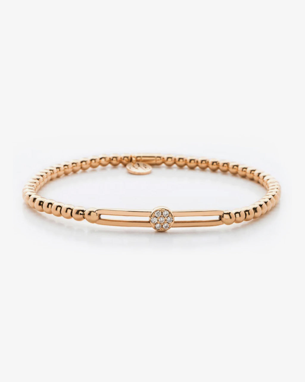 HULCHI BELLUNI 'Tresore' Collection 18 Karat Rose Gold Diamond Expandable Bracelet. This Rose Gold Stretch Bracelet features a moveable bead set with Diamonds. Total Diamond Weight =0.08ct.