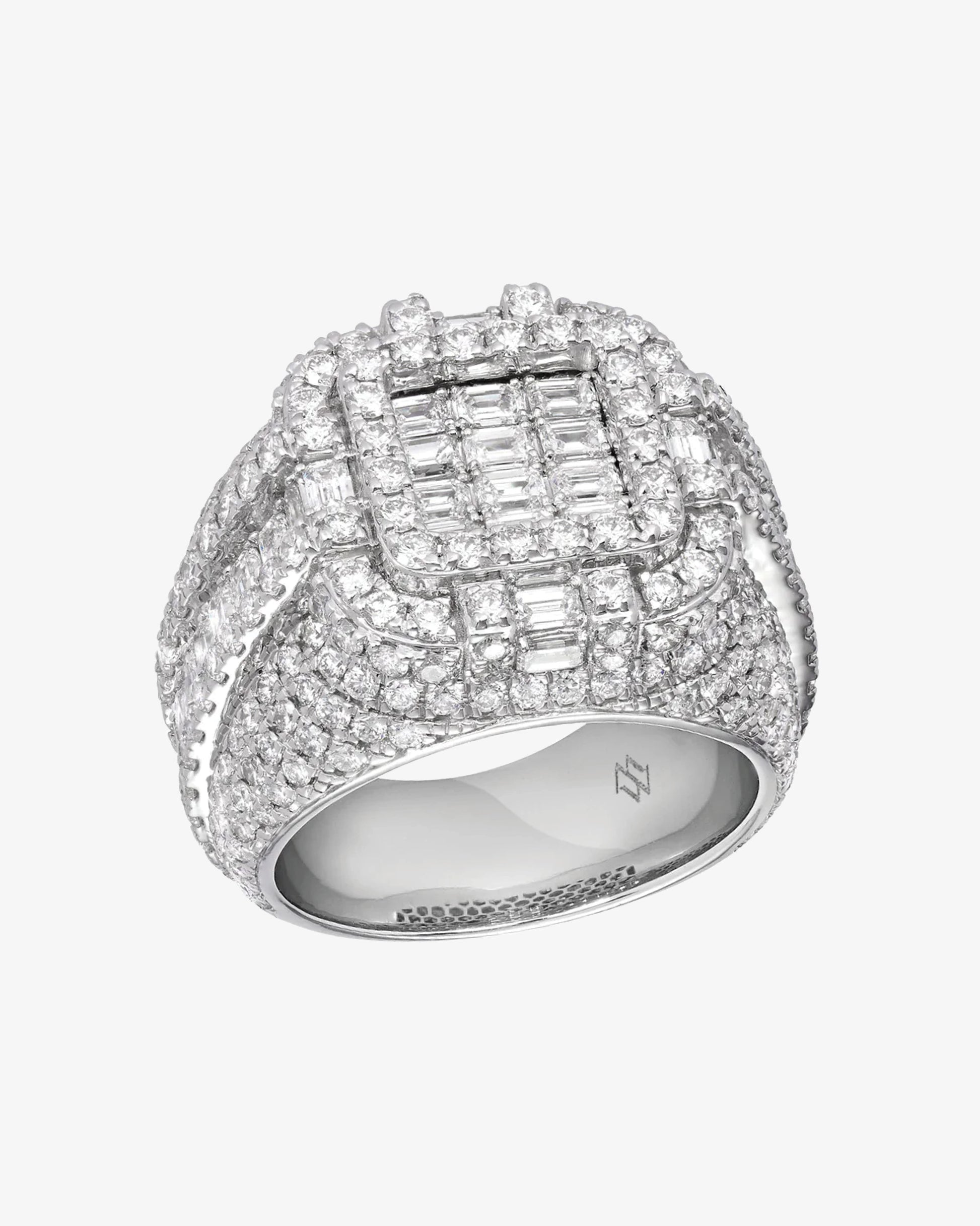 18 Karat White Gold Diamond Ring featuring 2.77ct emerald cut and 4.16ct round brilliant, F/G colour and VS clarity Diamonds.
