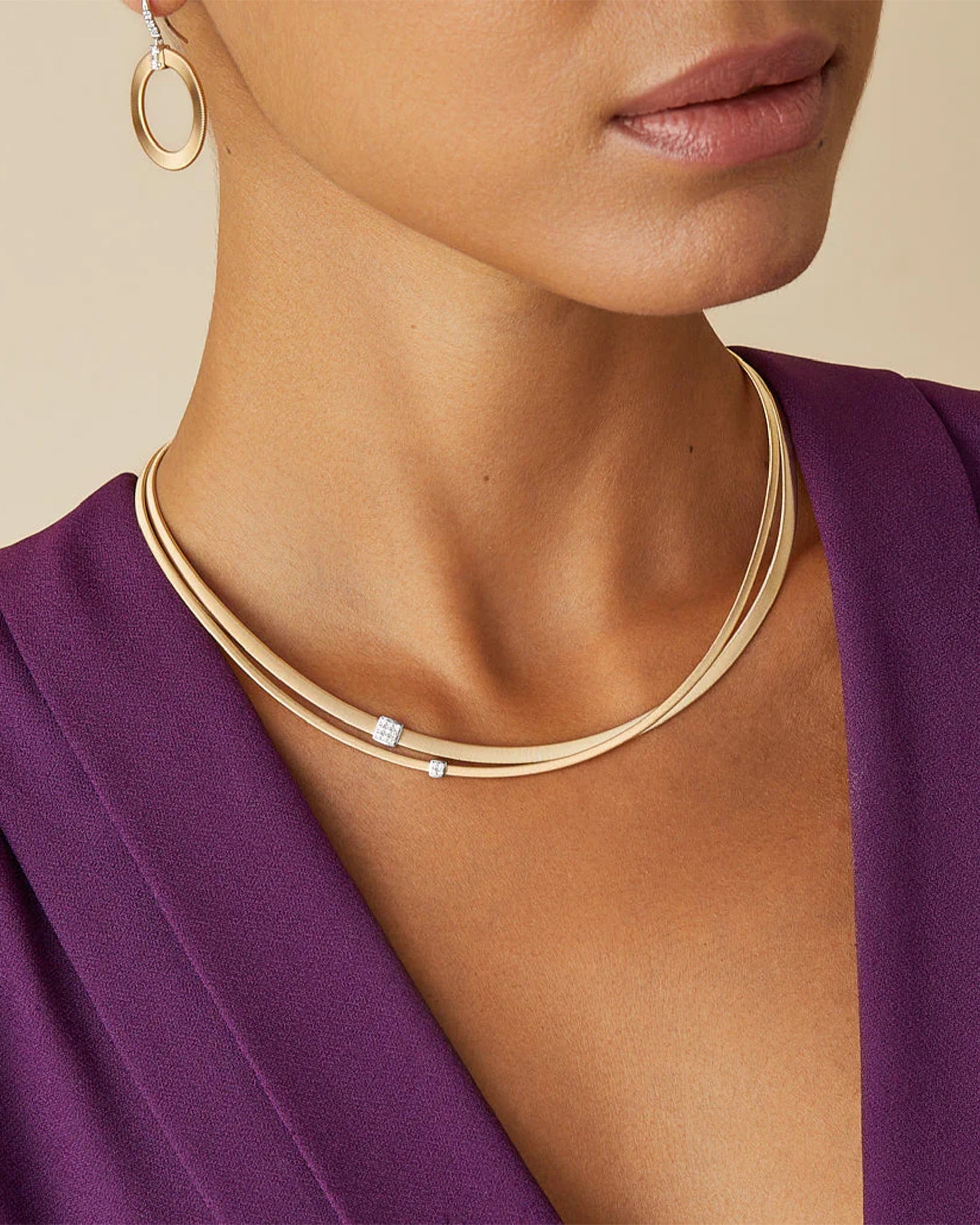 A timeless classic, this 18 Karat yellow gold multi-strand flat-coil necklace is embellished with sophisticated brilliant-cut diamond pavé elements totaling 0.10ct.