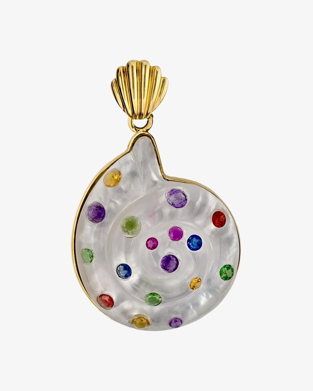 A quirky Snail Pendant made of 18ct Yellow Gold, Mother of Pearl, Crystal and an array of faceted Tsavorite, Garnet, Ruby, Sapphire, Pink Tourmaline, Amethyst & Peridot. This pendant also features a hook to hang a detachable pearl or pendant. (Combination and placement of stones may vary as these are a hand made item).