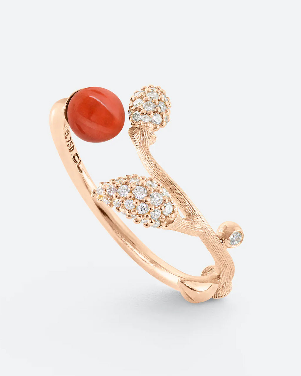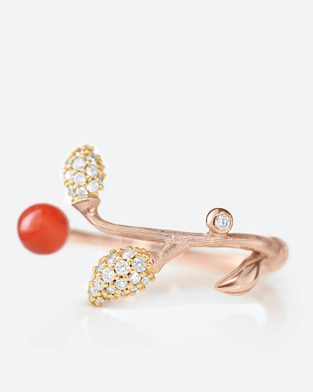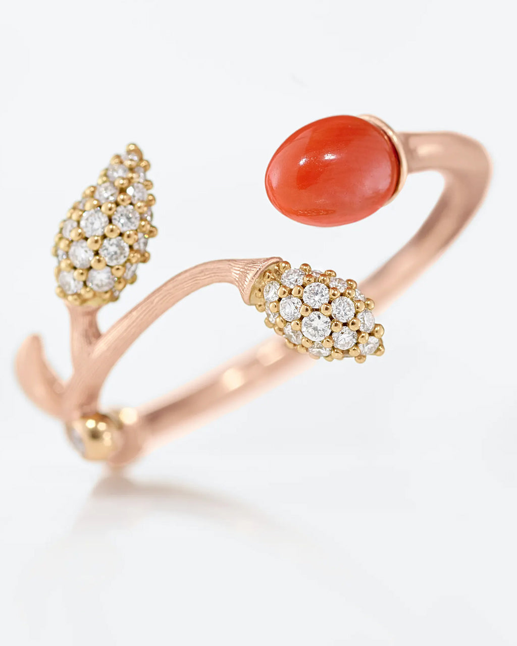 The ‘Blooming’ ring is crafted from 18 Karat, hand-satinised Rose and Yellow Gold. With one bezel-set Diamond, and 43 pavé-set Diamonds totaling 0.18ct TW. VS, and a Coral cabochon. Handcrafted by master goldsmiths.