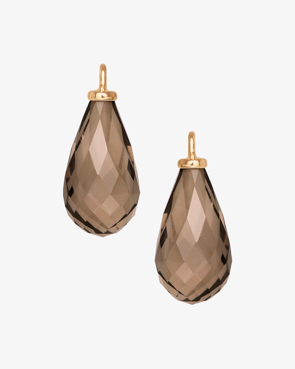 The earring pendant drop is crafted from 18 Karat Yellow Gold with a facetted, 12x7mm Smoky Quartz cabochon drop.