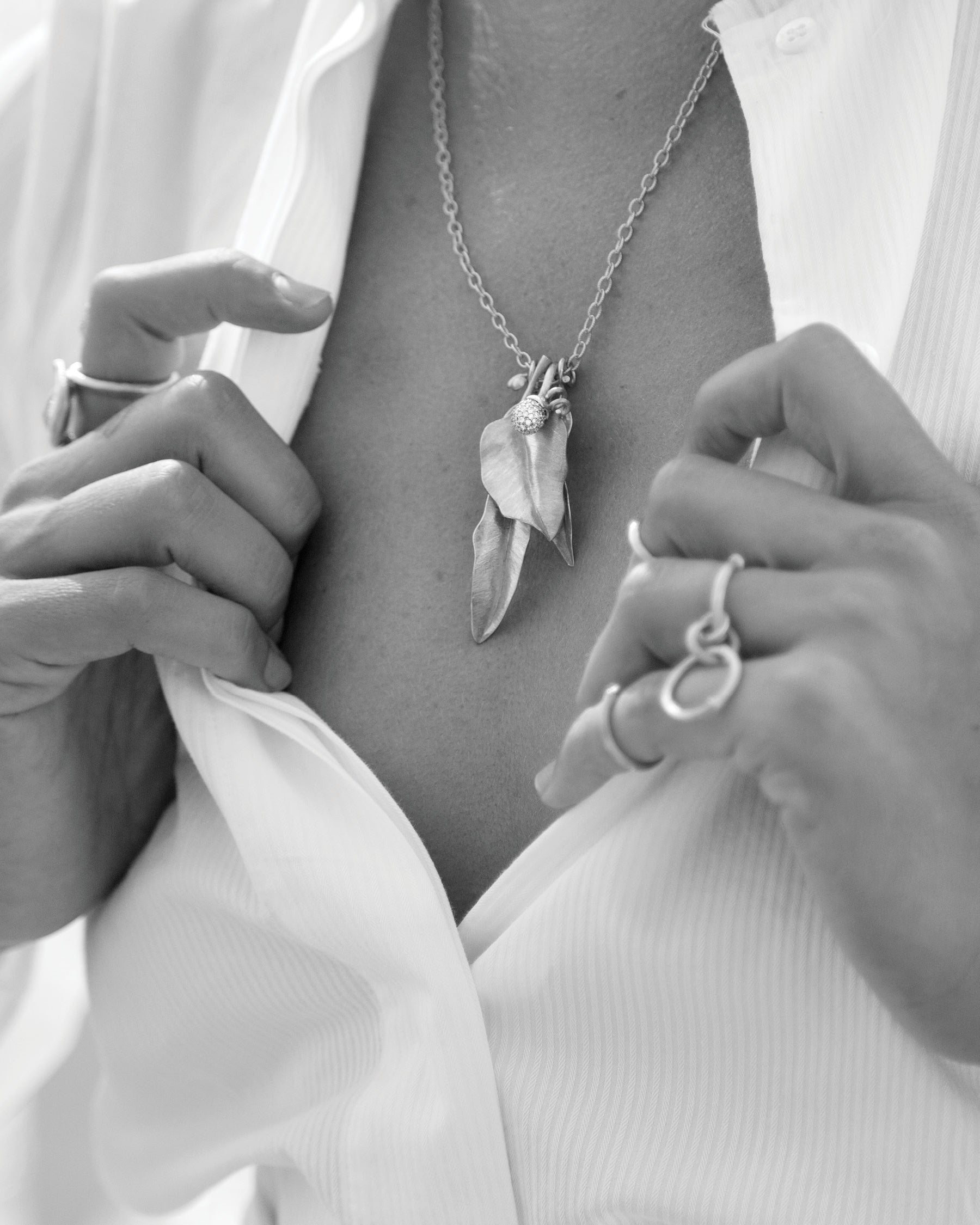 The 'Leaves' 4.5 cm pendant is crafted from 18 karat rose gold. Using several different techniques and tools, master goldsmiths sculpt and finish the surface of the delicate leaf by hand.