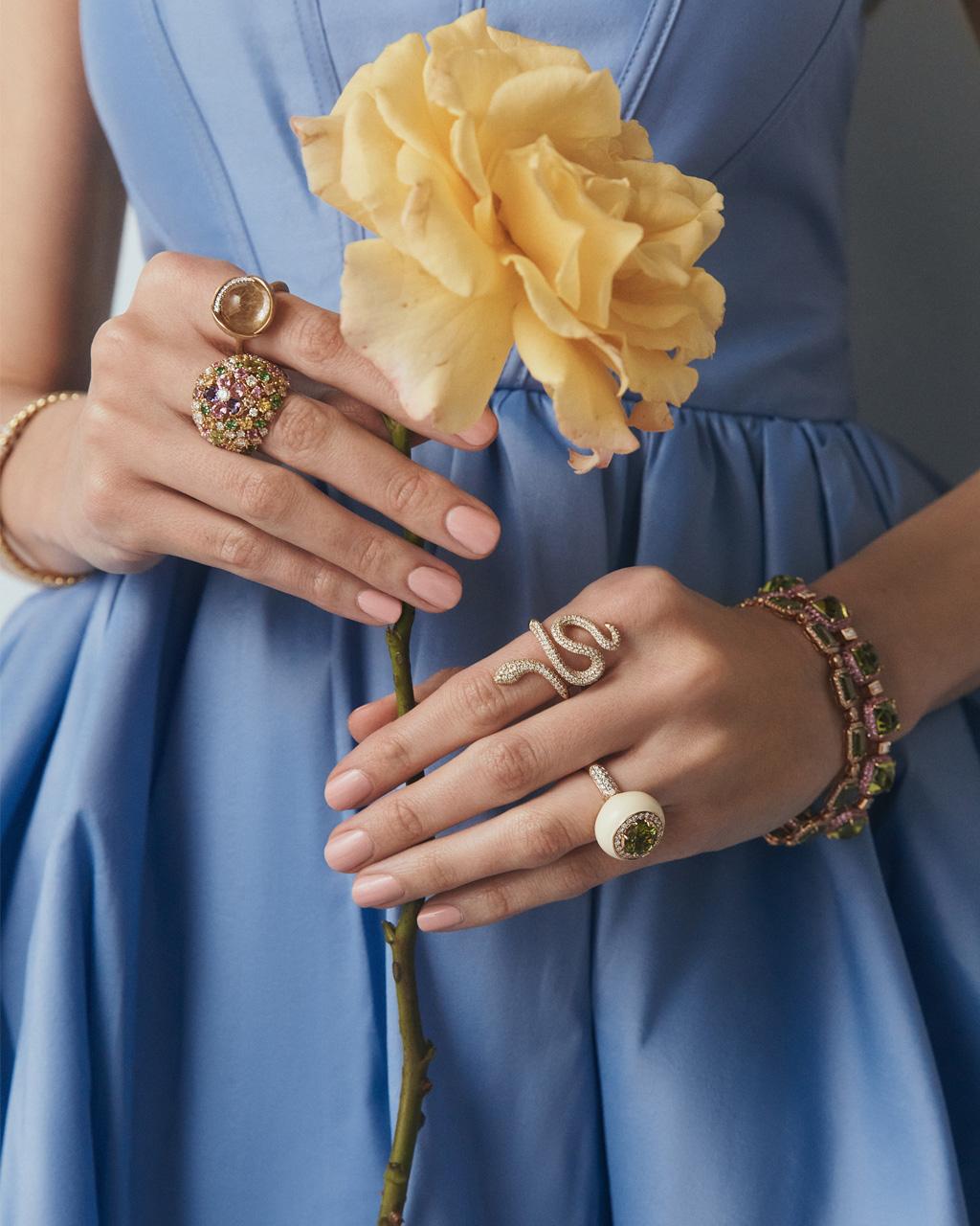 The ‘Snakes’ pavé Diamond ring is handcrafted by master goldsmiths in 18ct Yellow Gold, with 239 pavé-set Diamonds in different sizes following the shape of the ring, totaling 1.35ct TW. VS.