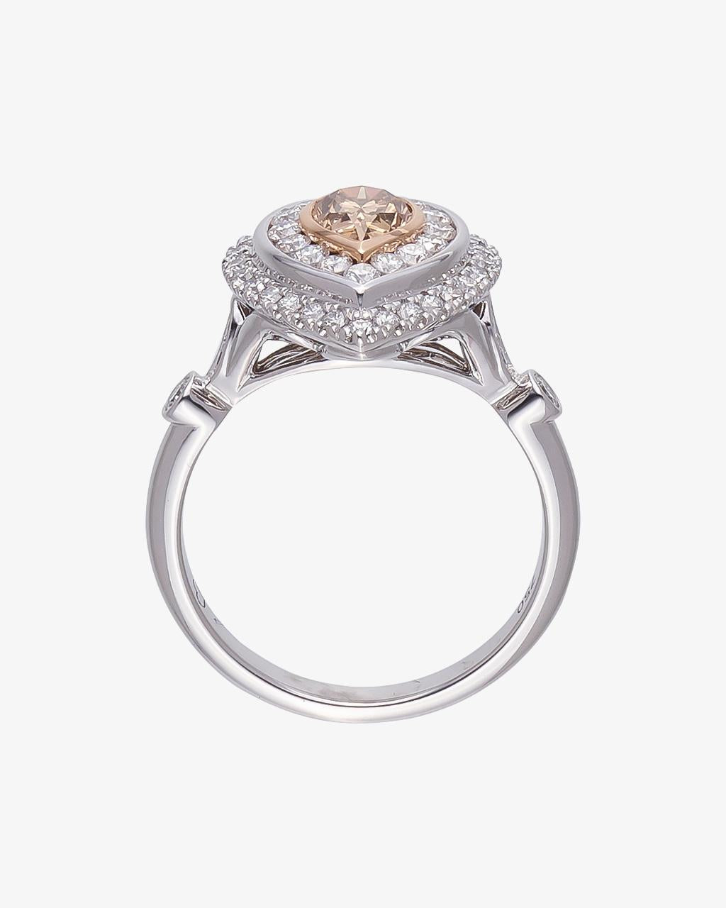 This Cognac and White Diamond ring combines modern elegance with classic sophistication. Featuring a pear cut Cognac Diamond surrounded by a double halo of round brilliant cut Diamonds. Crafted from 18 Karat White and Rose Gold.