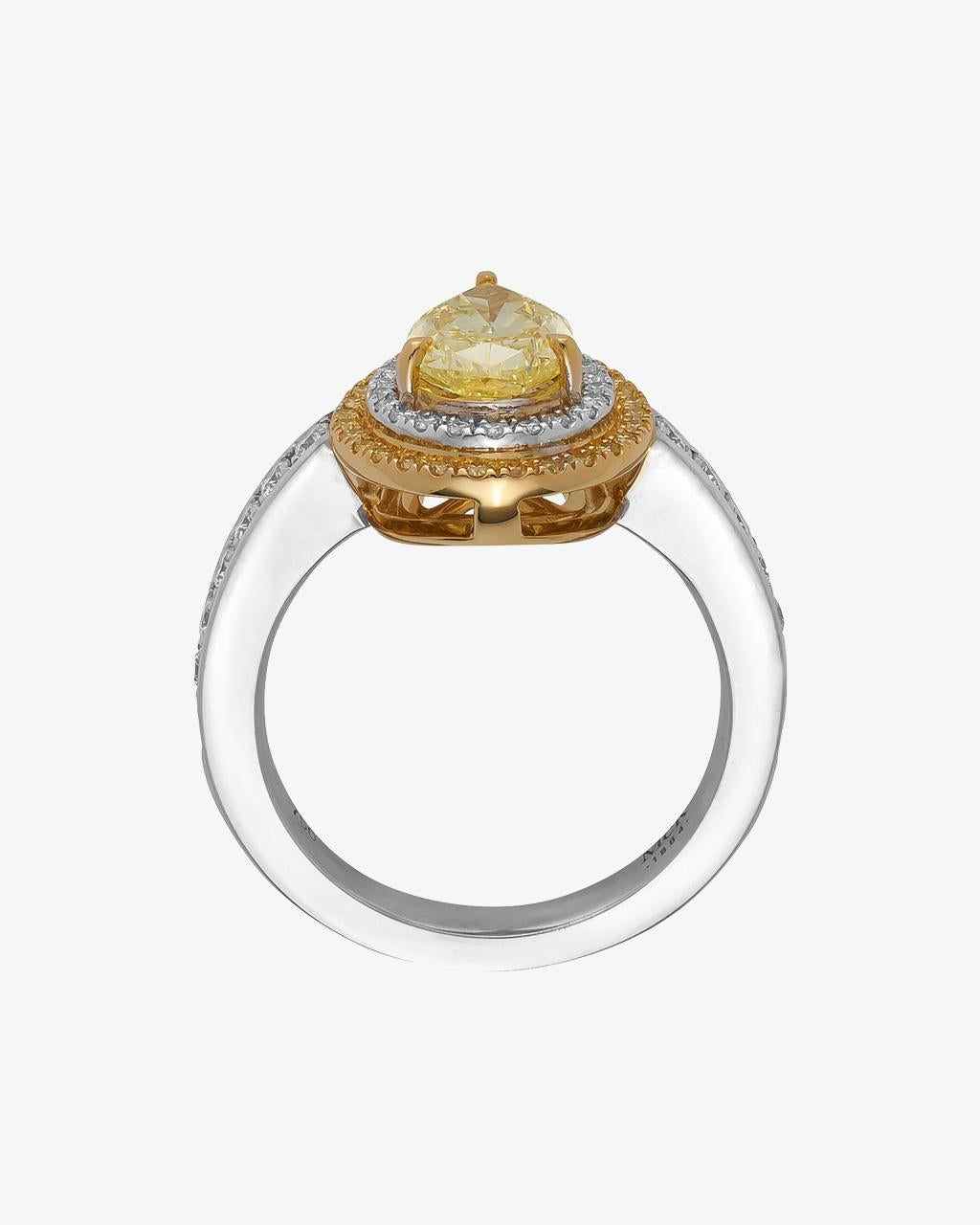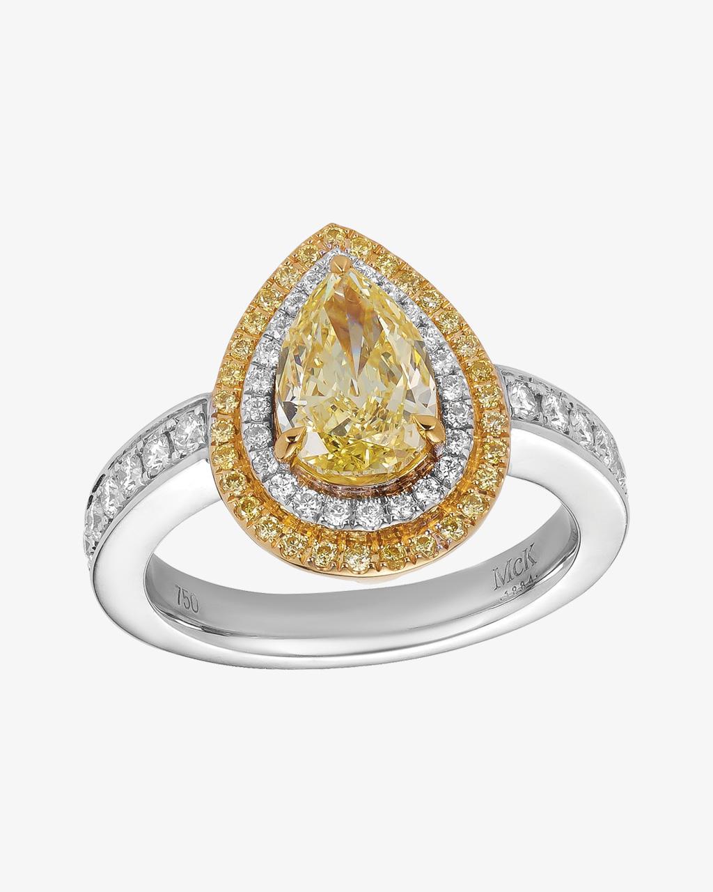 Make a statement with this fancy yellow pear cut Diamond ring featuring a double halo of white and yellow Diamonds. Crafted from 18 karat Yellow and White Gold.