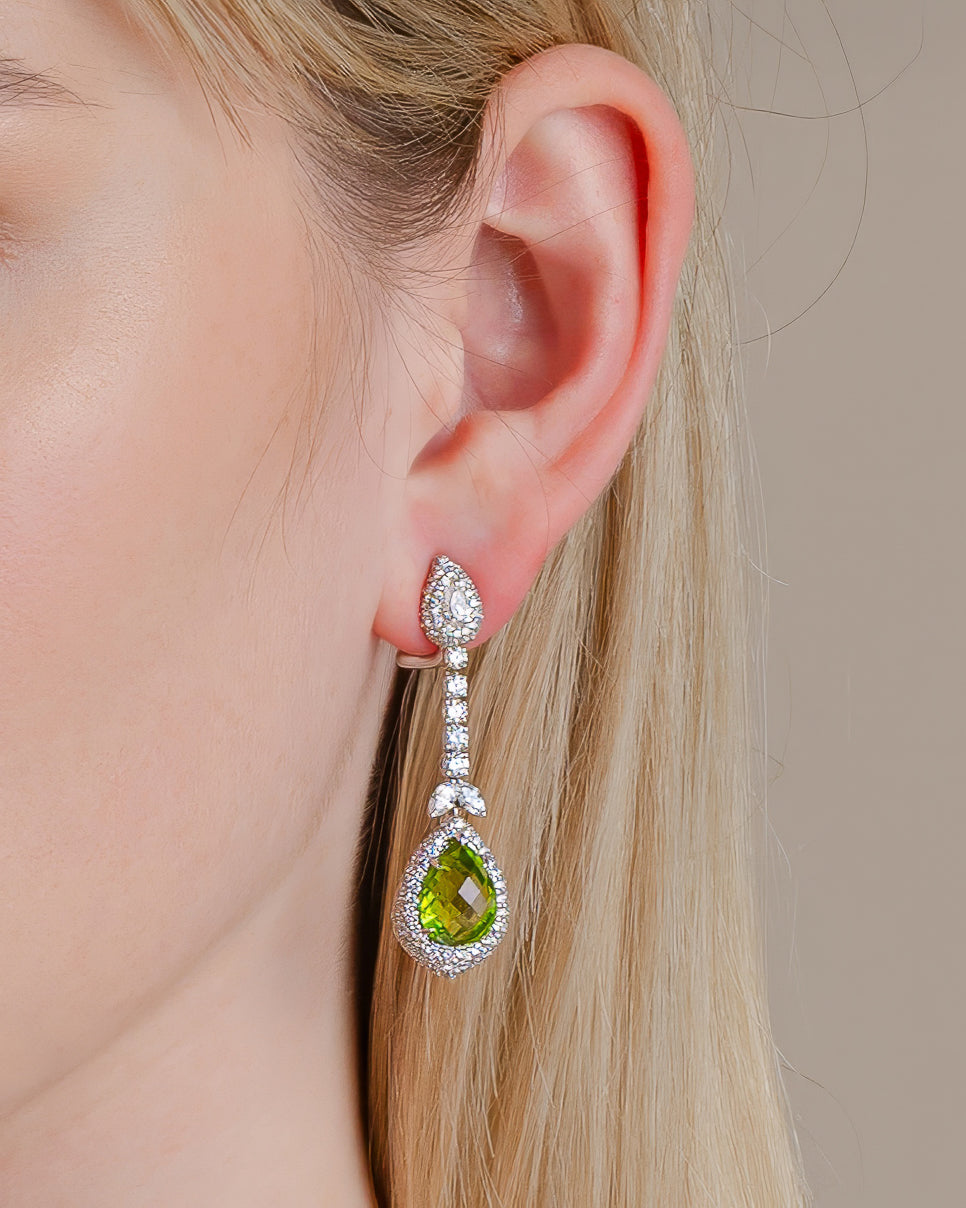 Elegant pear shape peridot and diamond earrings set in 18 karat white gold, secured with fix post and omega clip.