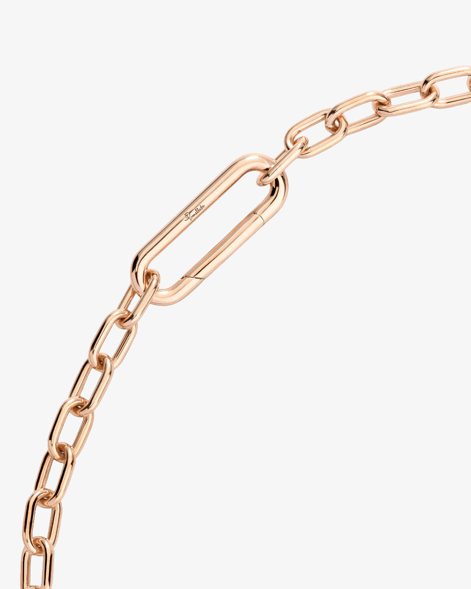 The chain necklace in rose gold features the distinctive outsize link snap-closure of Iconica, the simple lines are gender-fluid and their universal appeal is instantly evident. Essential and refined, inspired by Milanese design.