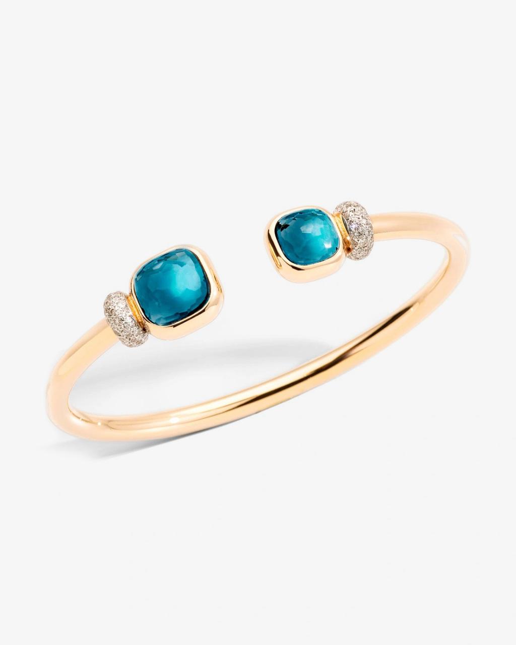 The vivacious colours and the asymmetrical stone sizes are Nudo design motifs that find new life in this very contemporary take on the classic bangle. Easy to wear and ready to stack, a rigid open bangle encircles the wrist placing against the skin two vividly bright gemstones. This bangle features gorgeous London Blue Topaz with Diamonds. Crafted in 18 Karat Rose Gold.