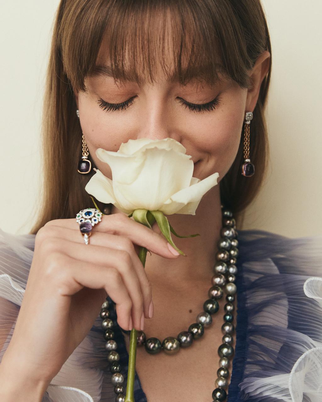 As Pomellato’s most iconic design, Nudo pieces are immediately recognisable, with no-prong ‘naked’ gemstones in a rainbow of colours. To pair with the rings or to wear as a complete parure, swingy Nudo Amethysts drop from Rose Gold earrings of shimmering Diamond pavé. Crafted in 18 Karat Rose & White Gold.