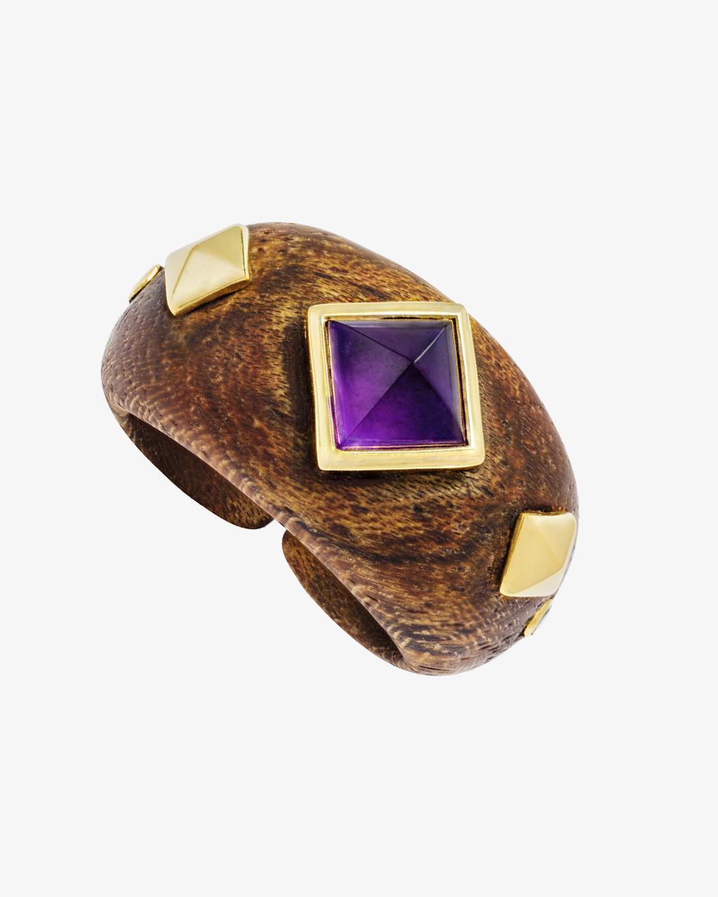 18 Karat Yellow Gold Rosewood Ring with Amethyst 1.22ct Pyramid and Tsavorite Garnet totaling 0.06ct.