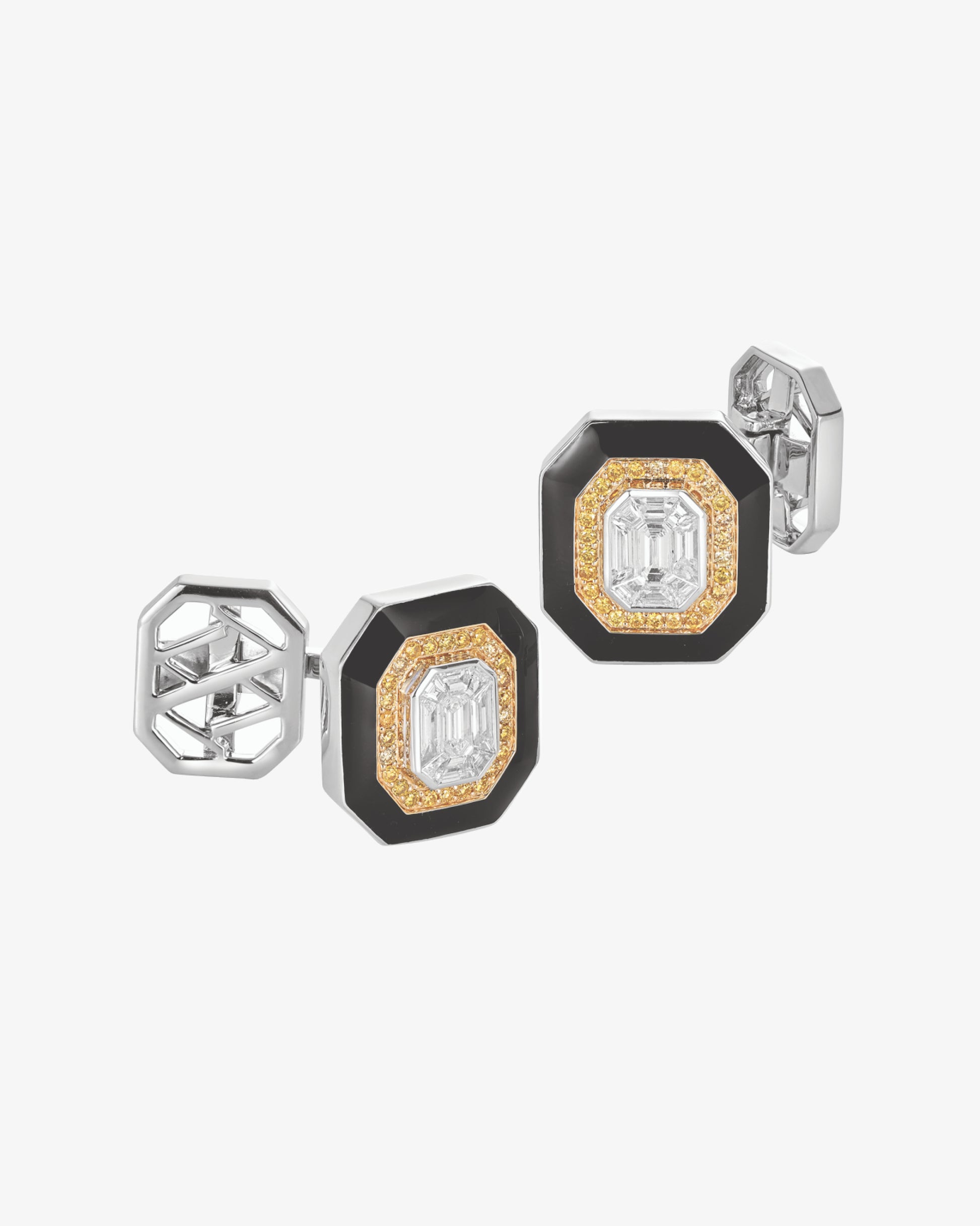 18 Karat White & Yellow Gold Diamond & Black Enamel Cufflinks featuring 18=1.01ct G colour, VVS-VS clarity, Invisible Set Diamonds, 52=0.44ct round brilliant cut Yellow Diamonds and 1.70ct Black Enamel.