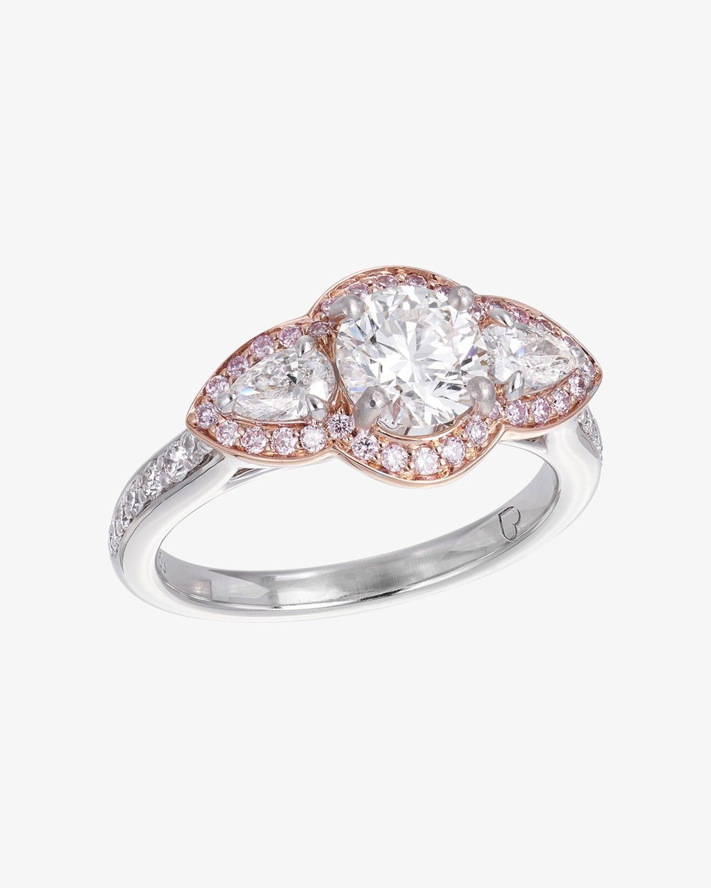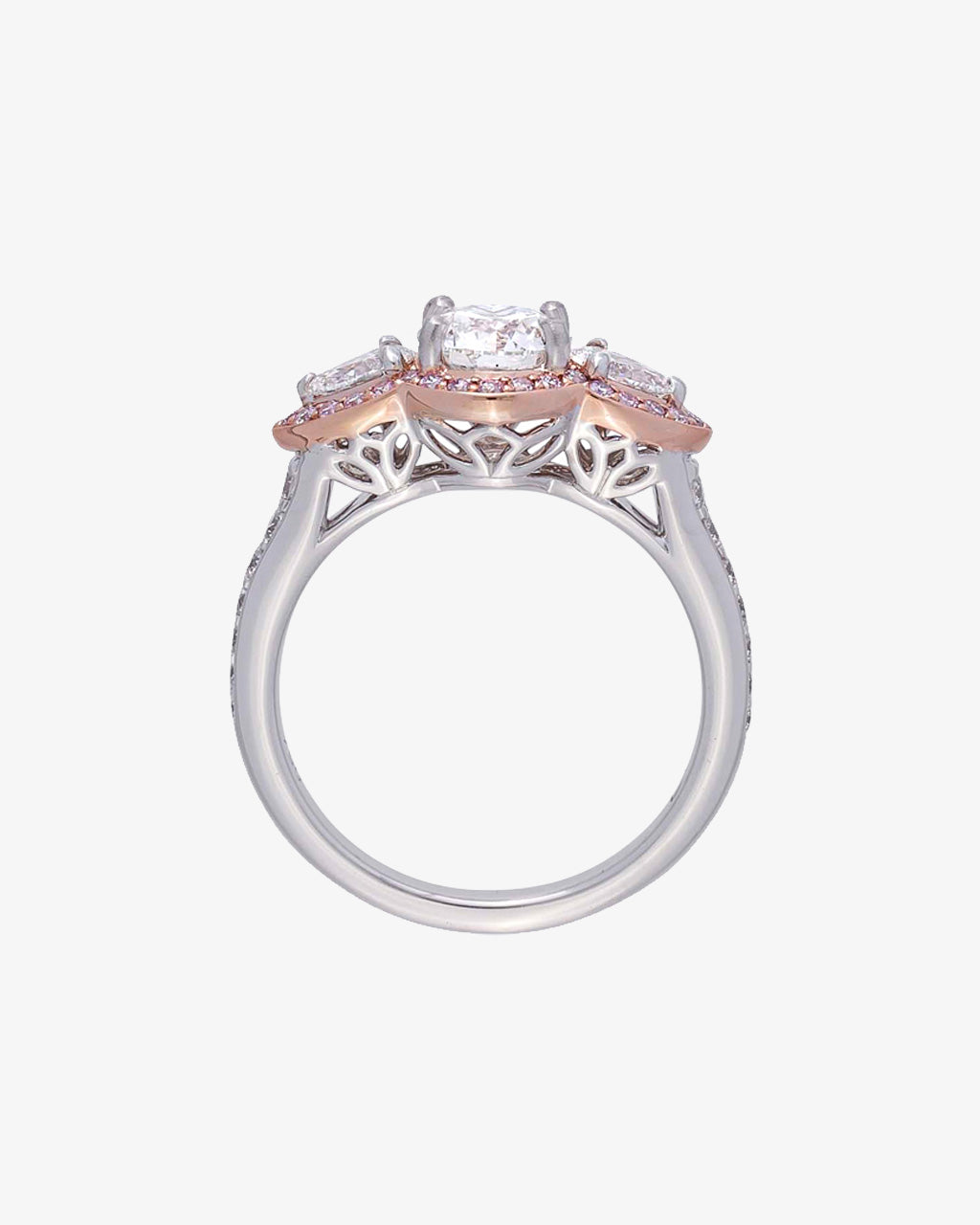 Pink and White Round and Pear Cut Diamond Halo Ring, crafted in 18 Karat White and Rose Gold.