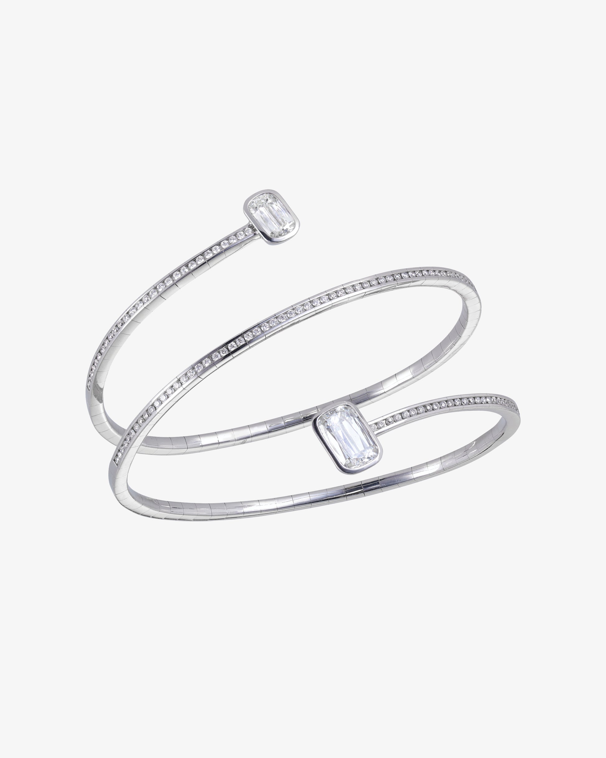 A mesmerising bangle bracelet, featuring two ASHOKA® cut diamonds on a swirling ribbon of micropavé diamonds, set in 18 Karat White Gold.