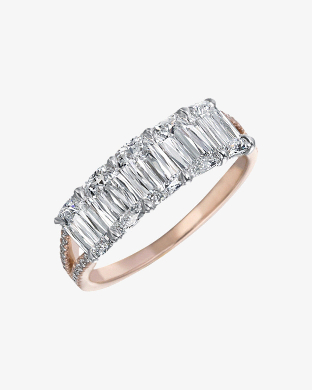 ASHOKA® Half Band Diamond Ring, featuring 5 perfectly matched ASHOKA® cut Diamonds shoulder set with melee Diamonds, set in 18 Karat Pink Gold.