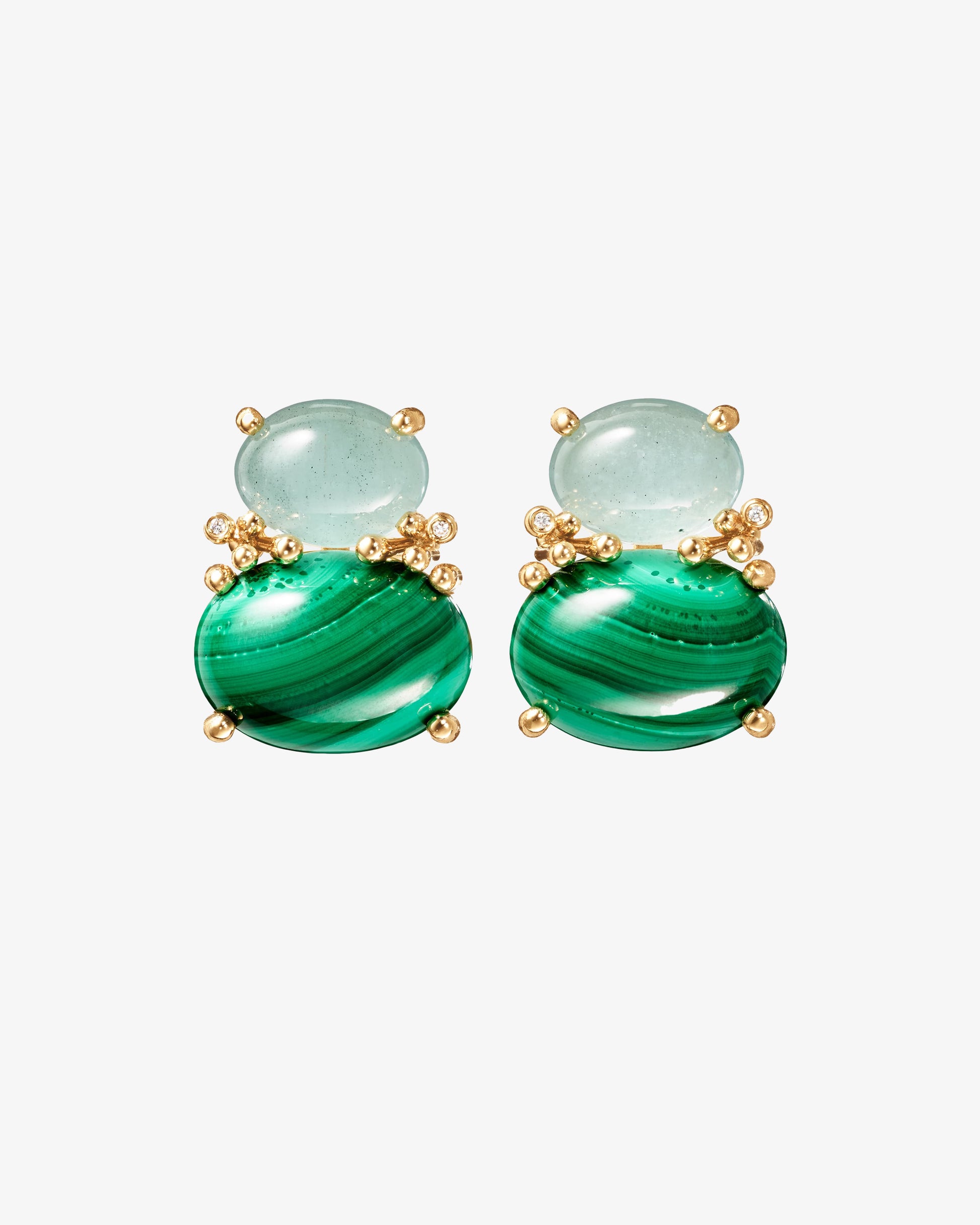 These BoHo stud earrings, designed by Charlotte Lynggaard, are crafted from 18 karat yellow gold, two aquamarines, two malachites, and four diamonds totalling 0.01 ct. TW VS. Each earring features a small eyelet for earring pendants. Please note: As gemstones are natural materials, each stone is truly unique. They will vary in colour and have individual, unique inclusions and features. The web images of the stones are only representatives of the unique stones you will receive when ordering the product, not the exact stones. Sold as a pair.