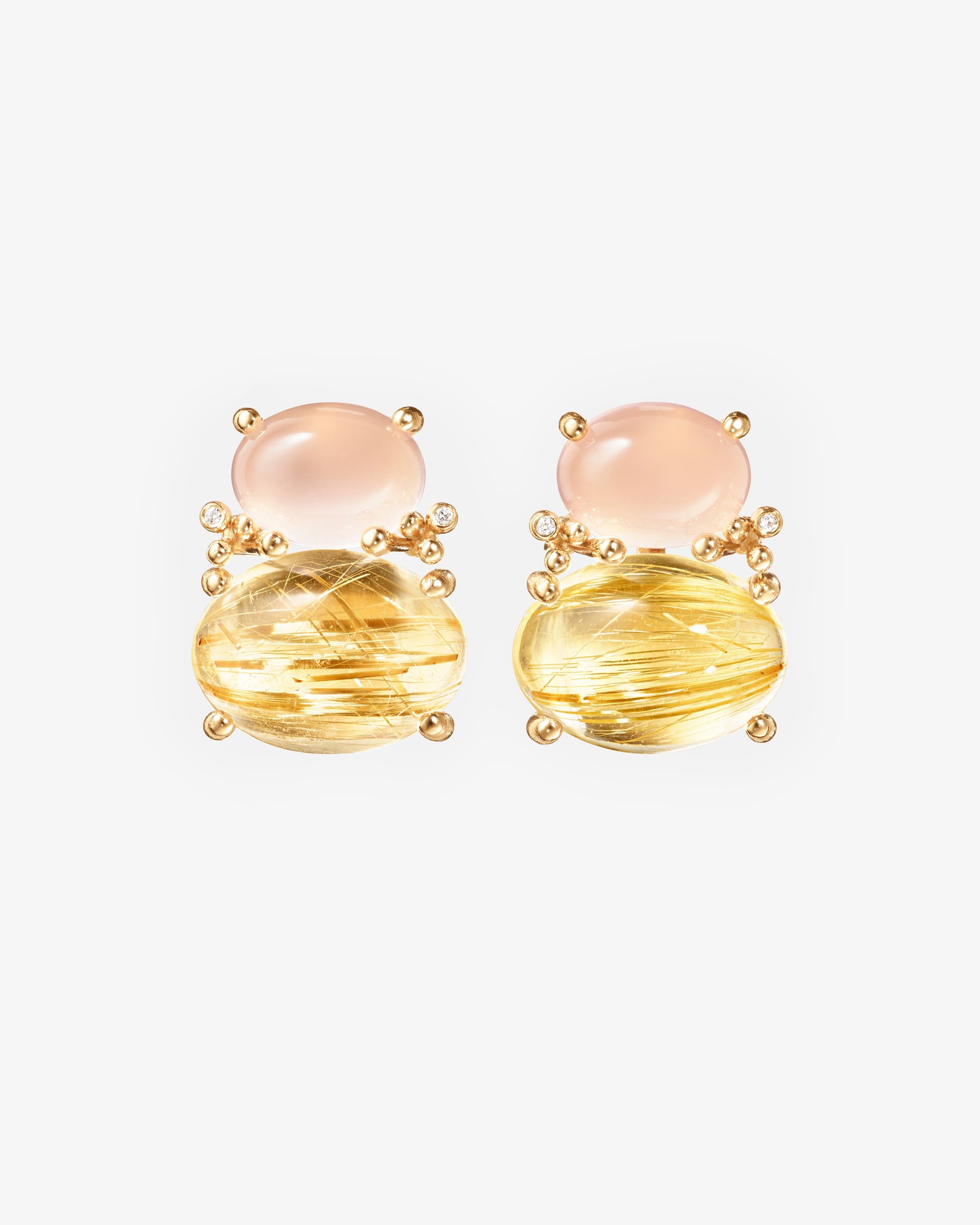 These BoHo stud earrings, designed by Charlotte Lynggaard, are crafted from 18 karat yellow gold, two rose quartz, two rutile quartz, and four diamonds totalling 0.01 ct. TW VS. Each earring features a small eyelet for earring pendants. Please note: As gemstones are natural materials, each stone is truly unique. They will vary in colour and have individual, unique inclusions and features. The web images of the stones are only representatives of the unique stones you will receive when ordering the product, not the exact stones. Sold as a pair.