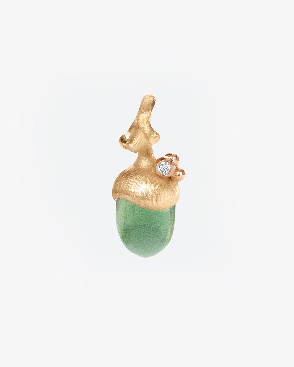 The Acorn pendant small is crafted from 18 karat yellow and rose gold with one diamond 0.01 carat TW. VS., and a green serpentine cabochon. The gold surfaces are hand-brushed by master goldsmiths for a matt finish.