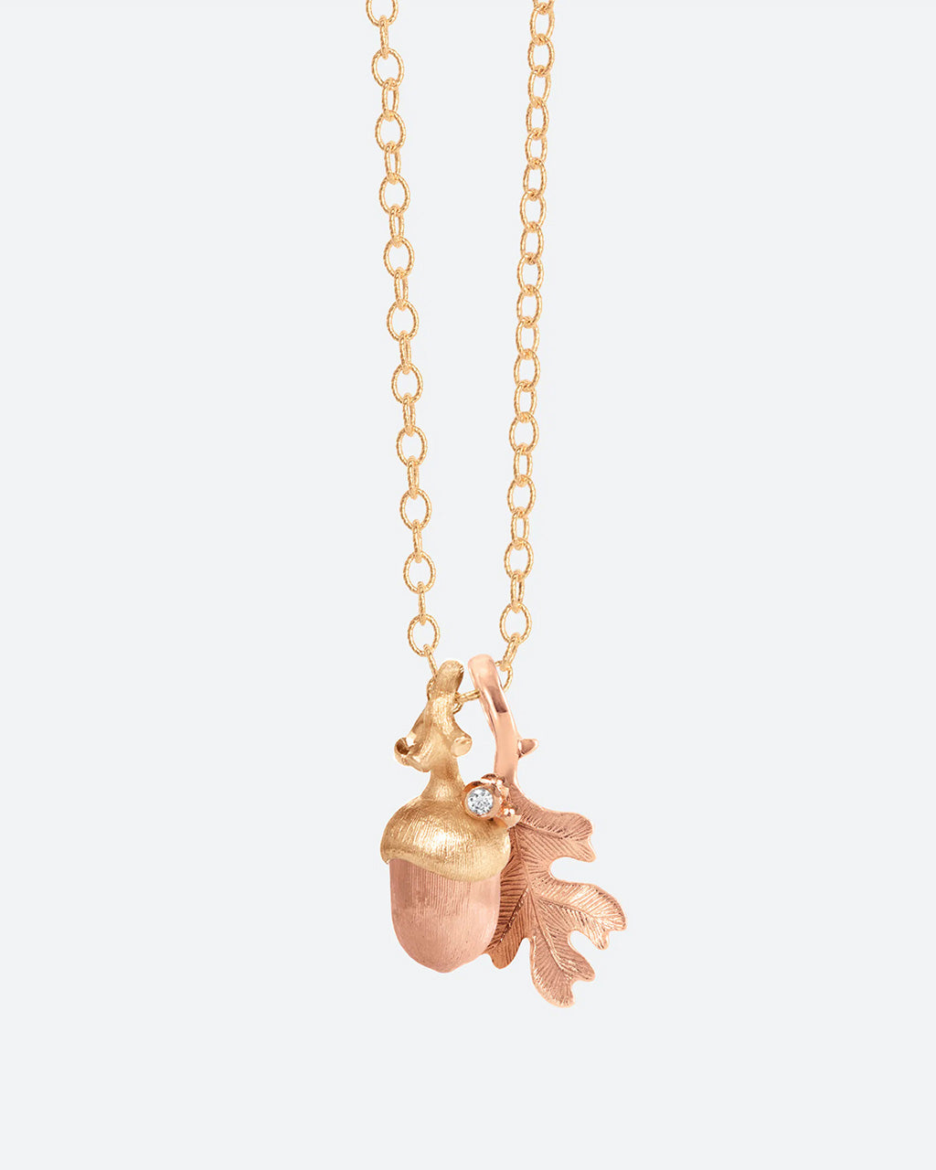 The Oak leaf pendant small is 20 mm high and crafted from 18 karat rose gold. Master goldsmiths hand-satinise the front of the pendant and polish the reverse.