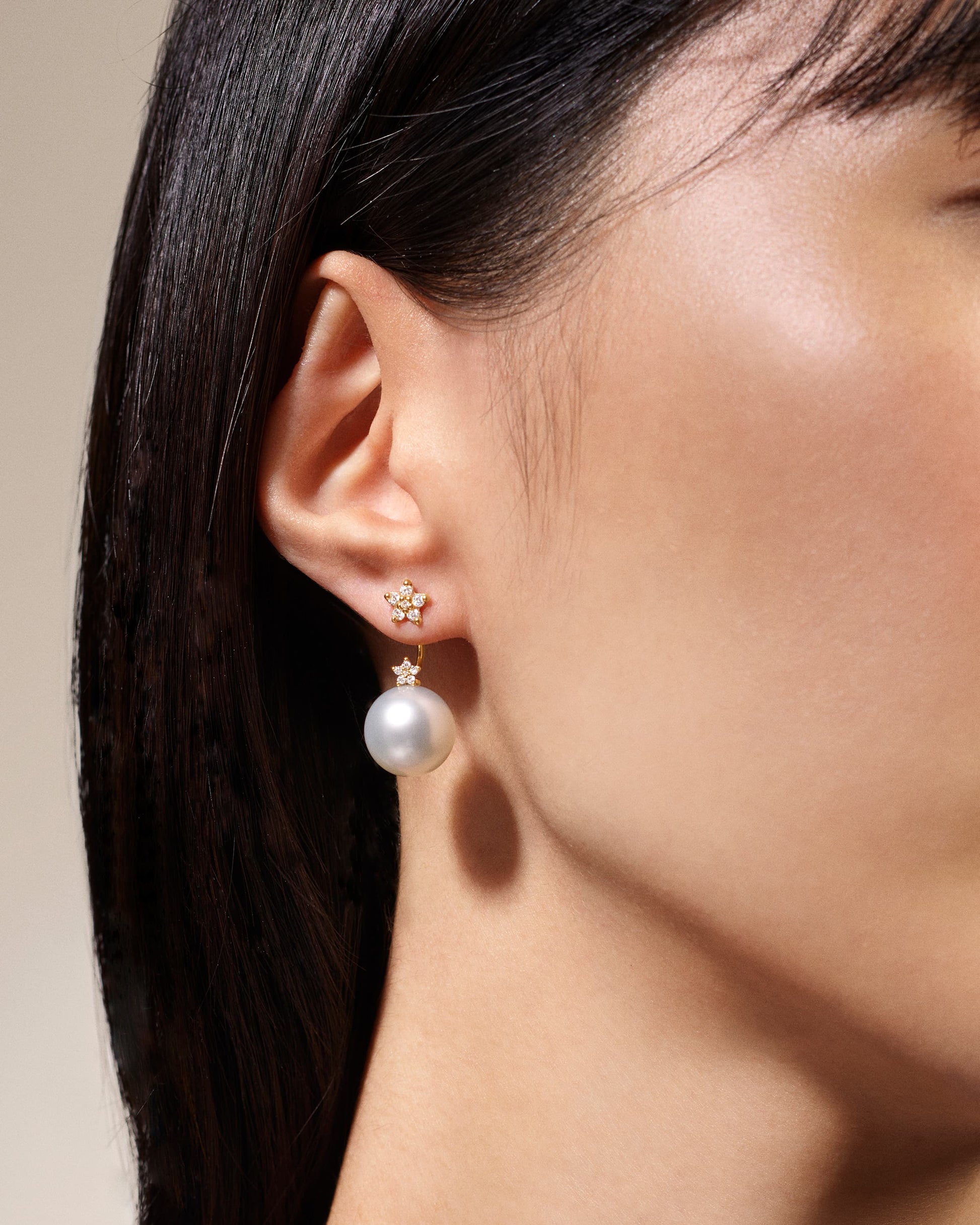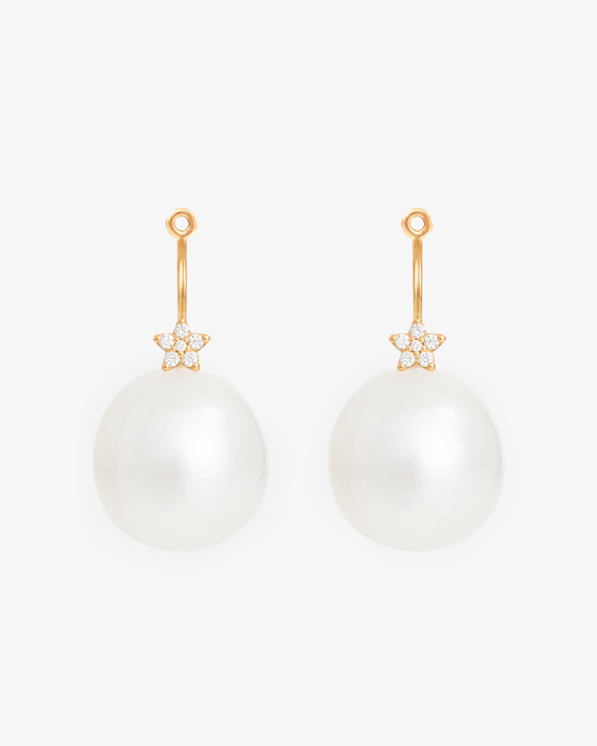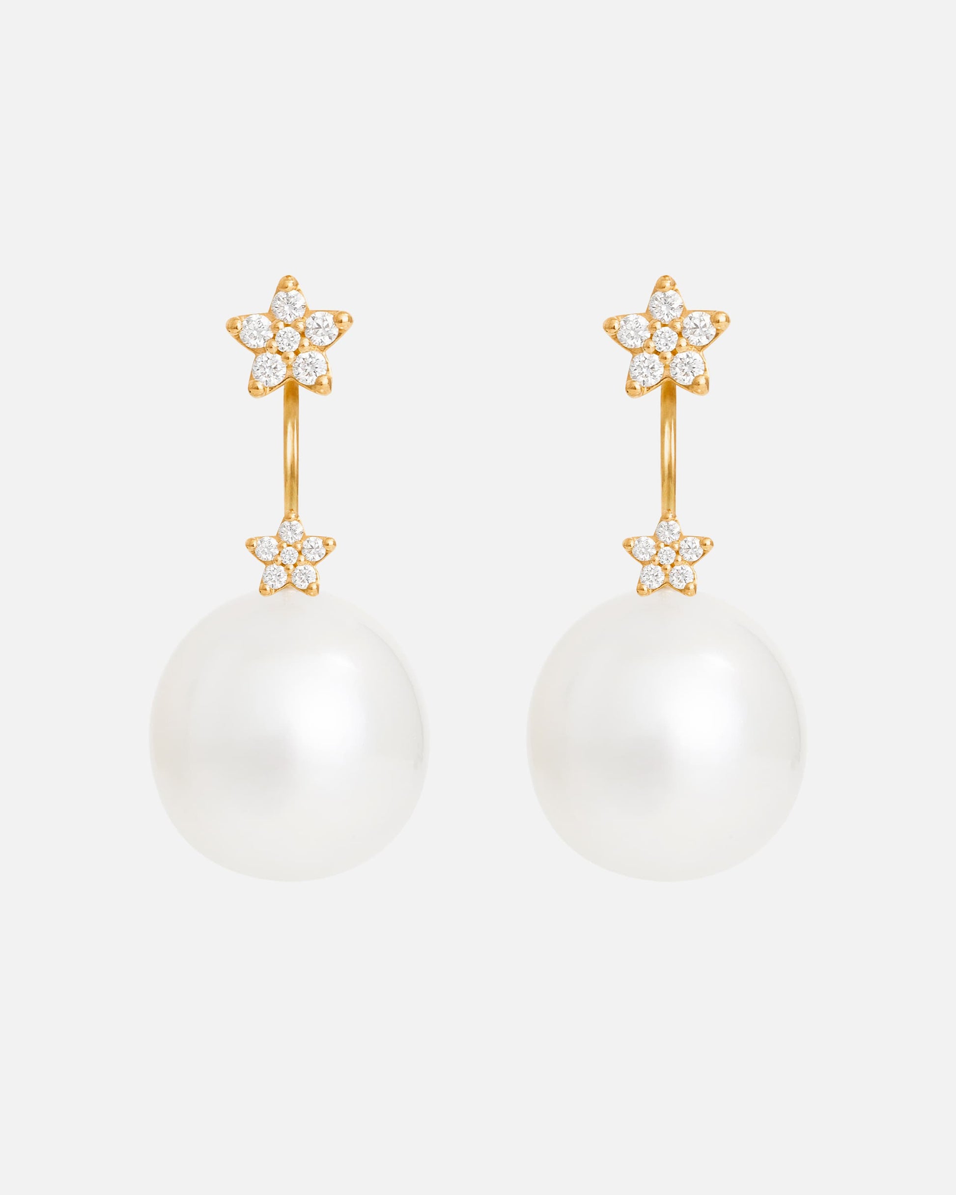 18 karat Yellow Gold Shooting Star Pearl Ear Pendant featuring 12 round brilliant cut TW VS Diamonds totaling 0.07ct and 2 x 13mm South Sea Pearls.