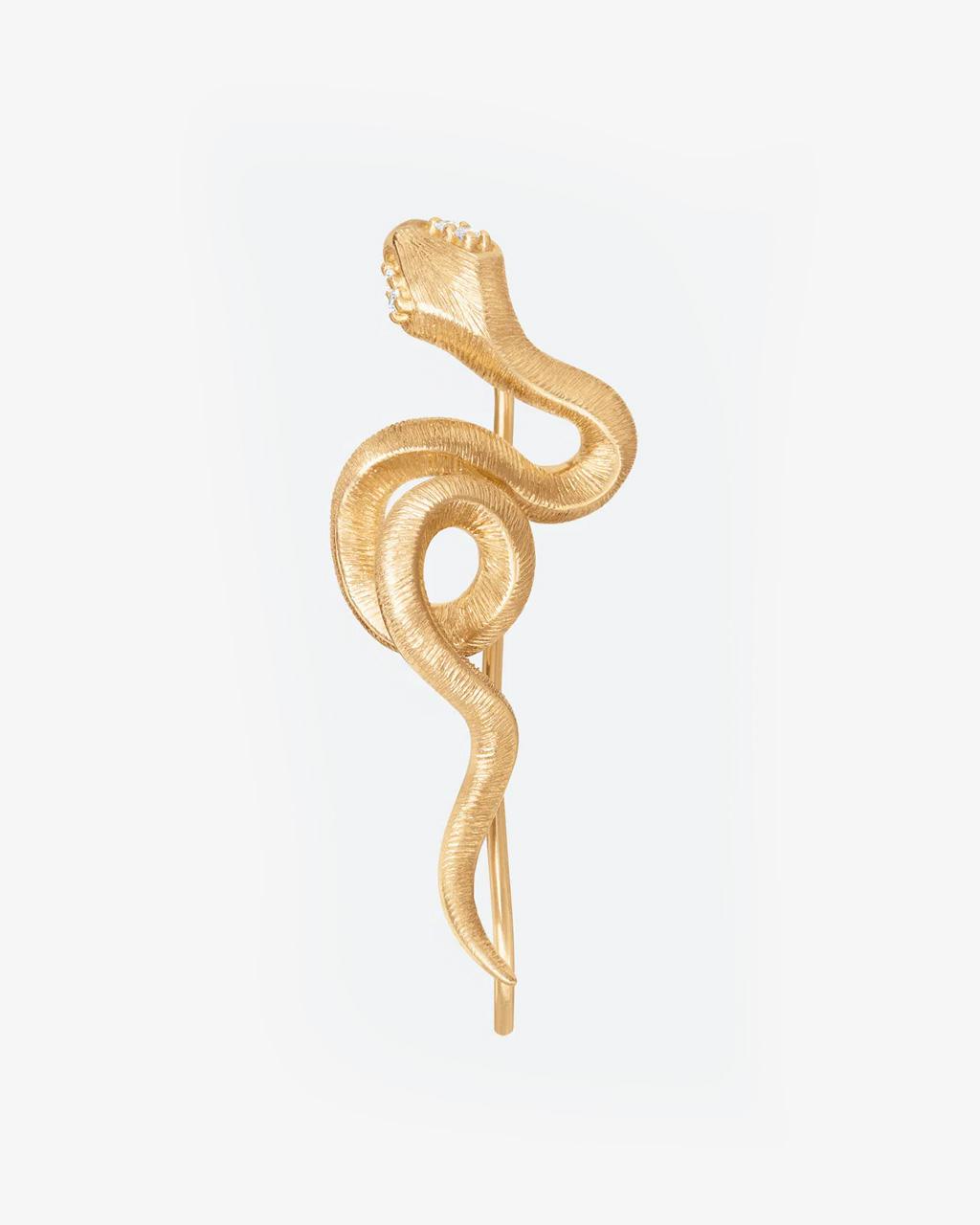 The ‘Snakes’ ear climber is crafted from 18 Karat Yellow Gold with 4 Diamonds totalling 0.01ct TW. VS. Handcrafted by master goldsmiths, the Gold surface on the front of the ear climber is hand-satinised, whilst the back and pin are polished to a smooth finish.