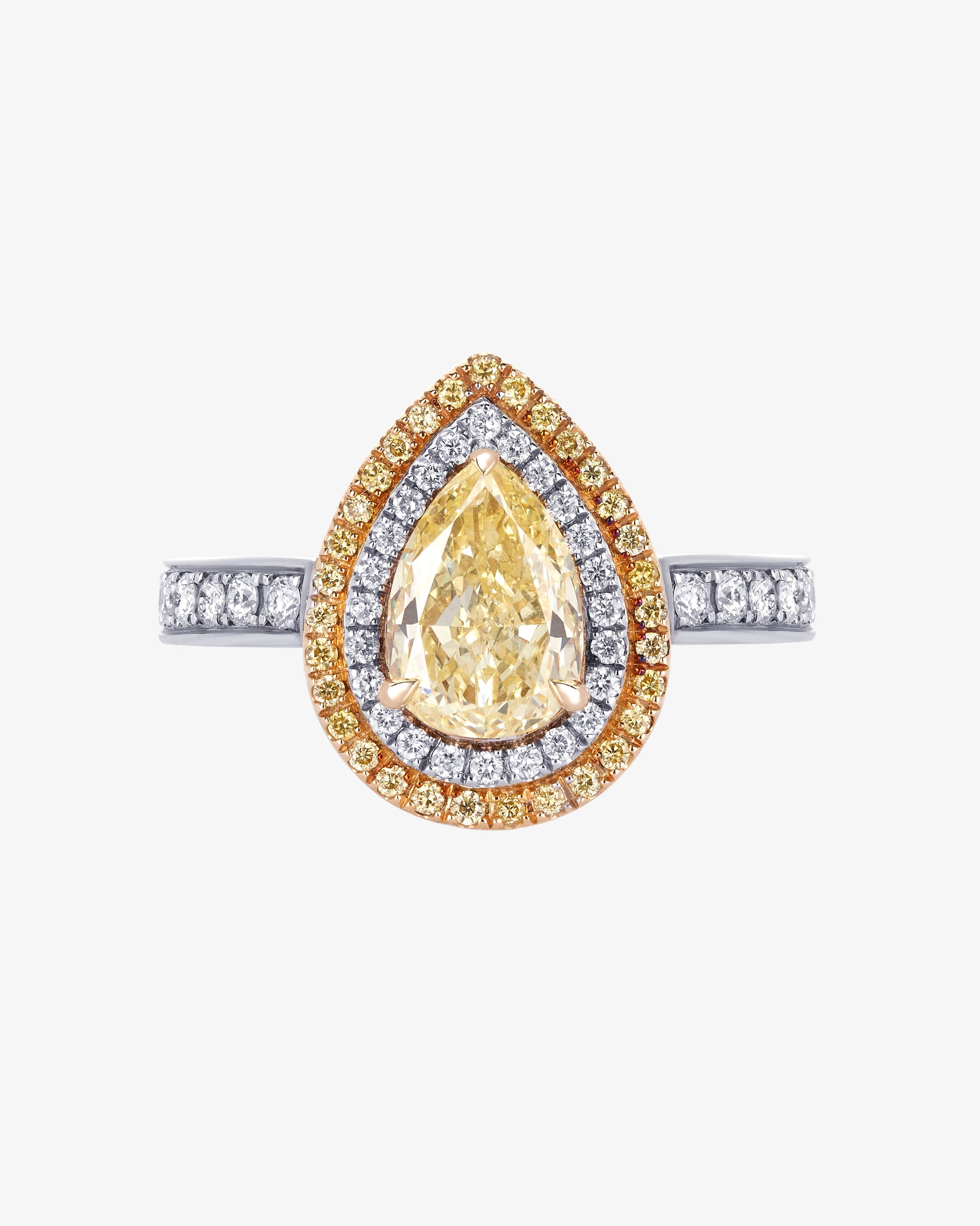 18 karat yellow and white gold fancy yellow pear cut diamond ring featuring a double halo of white and yellow diamonds.