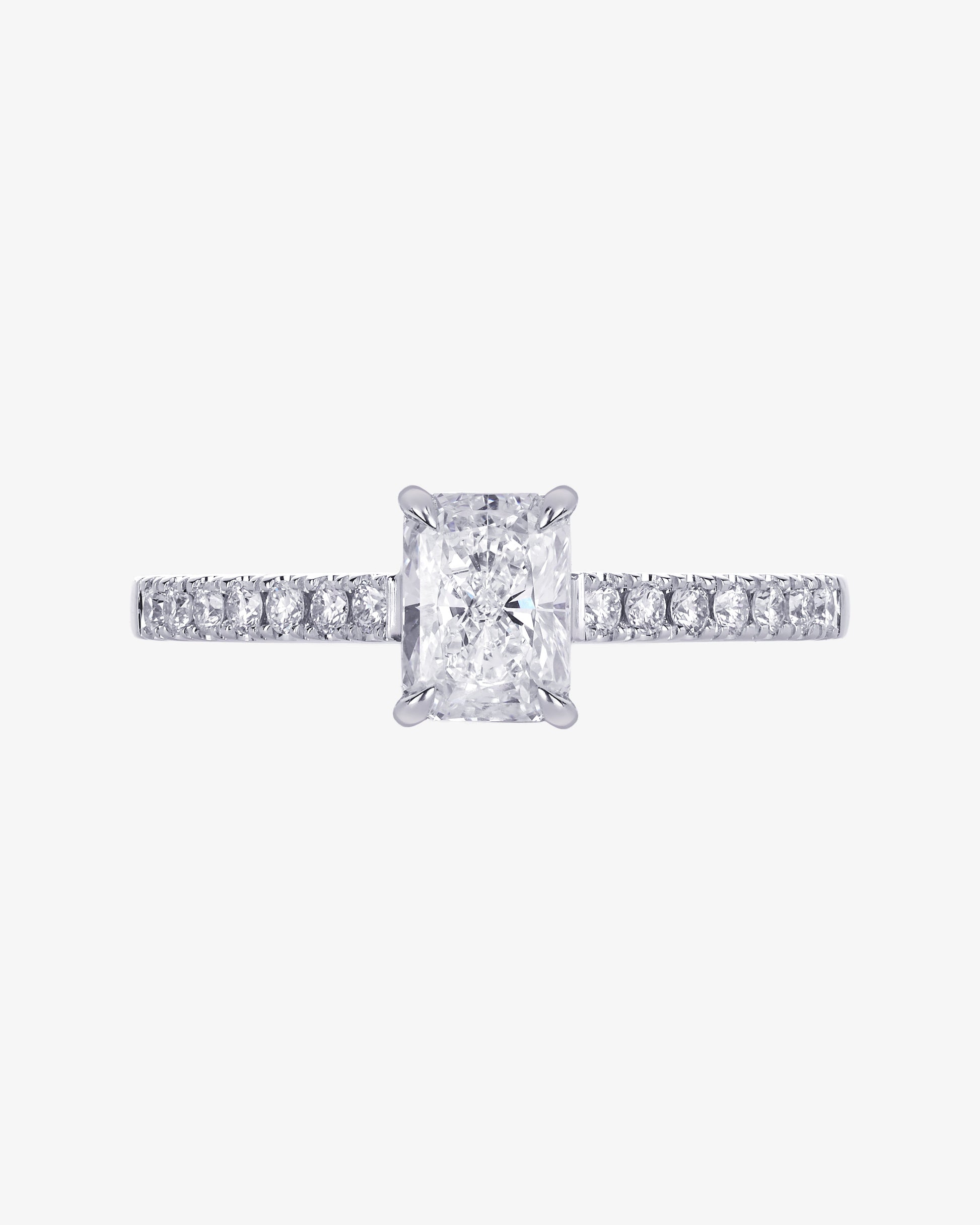 18 karat white gold radiant cut diamond engagement ring shoulder set with 14 round brilliant cut diamonds.