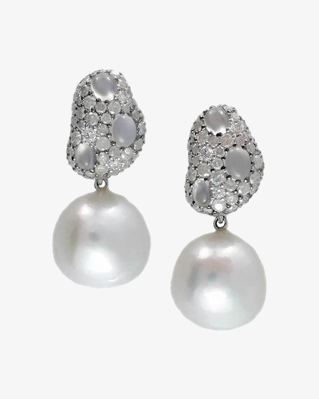 Beautiful White Moonstone, White & Milky Diamond Earrings with South Sea Pearl drops. Crafted in 18 Karat White Gold.